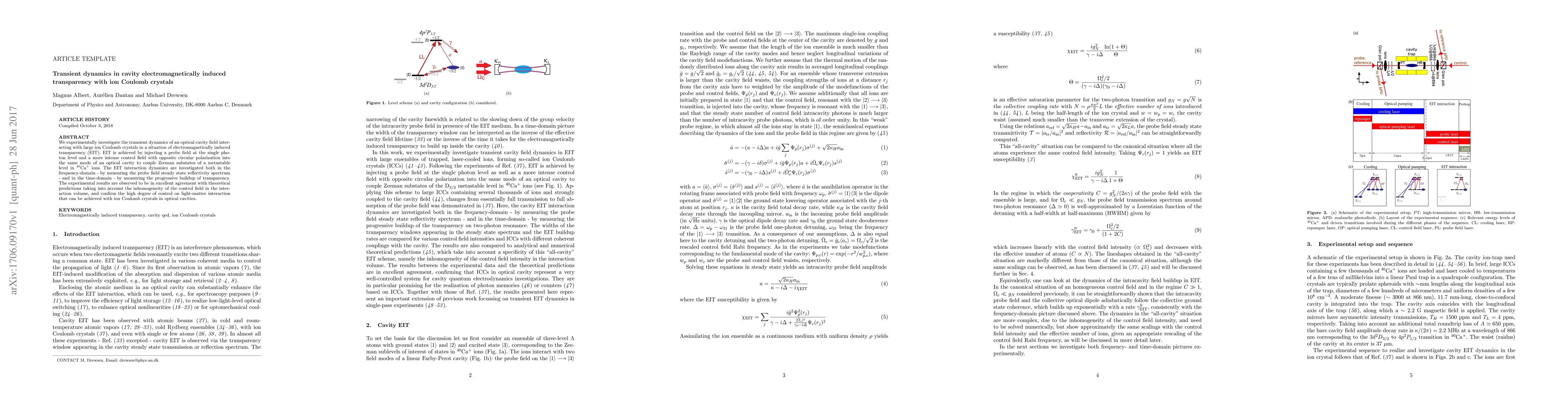 This paper investigates the transient dynamics of electromagnetically induced transparency (EIT) in optical cavities interacting with large ion Coulomb crystals, achieving EIT with a probe and control field. The study confirms theoretical predictions of EIT dynamics and demonstrates precise control over light-matter interactions using ion crystals.