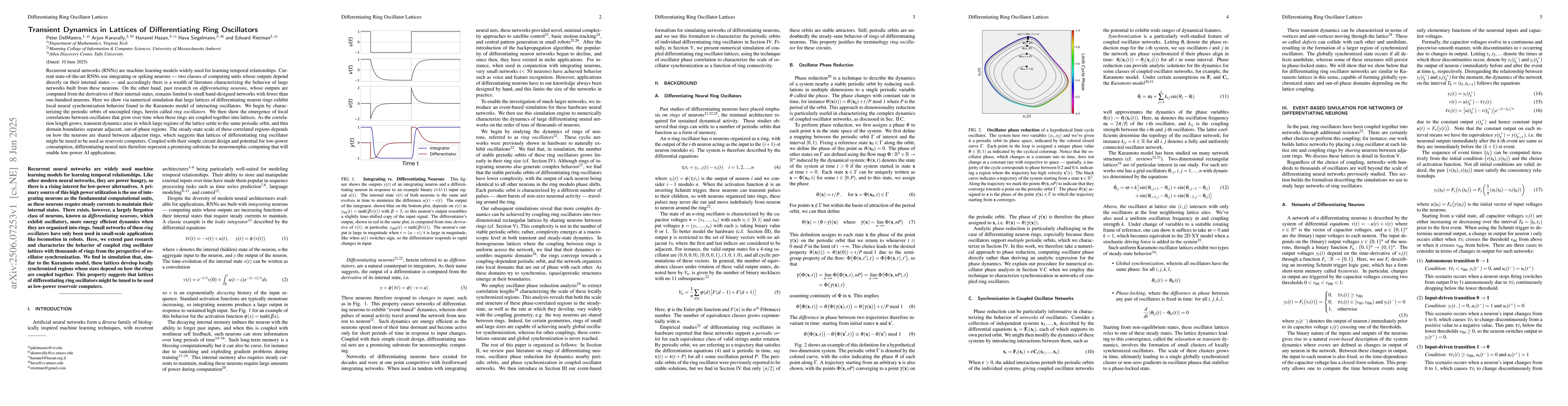 Recurrent neural networks (RNNs) are machine learning models widely used for learning temporal relationships. Current state-of-the-art RNNs use integrating or spiking neurons -- two classes of computing units whose outputs depend directly on their internal states -- and accordingly there is a wealth of literature characterizing the behavior of large networks built from these neurons. On the other hand, past research on differentiating neurons, whose outputs are computed from the derivatives of their internal states, remains limited to small hand-designed networks with fewer than one-hundred neurons. Here we show via numerical simulation that large lattices of differentiating neuron rings exhibit local neural synchronization behavior found in the Kuramoto model of interacting oscillators. We begin by characterizing the periodic orbits of uncoupled rings, herein called ring oscillators. We then show the emergence of local correlations between oscillators that grow over time when these rings are coupled together into lattices. As the correlation length grows, transient dynamics arise in which large regions of the lattice settle to the same periodic orbit, and thin domain boundaries separate adjacent, out-of-phase regions. The steady-state scale of these correlated regions depends on how the neurons are shared between adjacent rings, which suggests that lattices of differentiating ring oscillator might be tuned to be used as reservoir computers. Coupled with their simple circuit design and potential for low-power consumption, differentiating neural nets therefore represent a promising substrate for neuromorphic computing that will enable low-power AI applications.