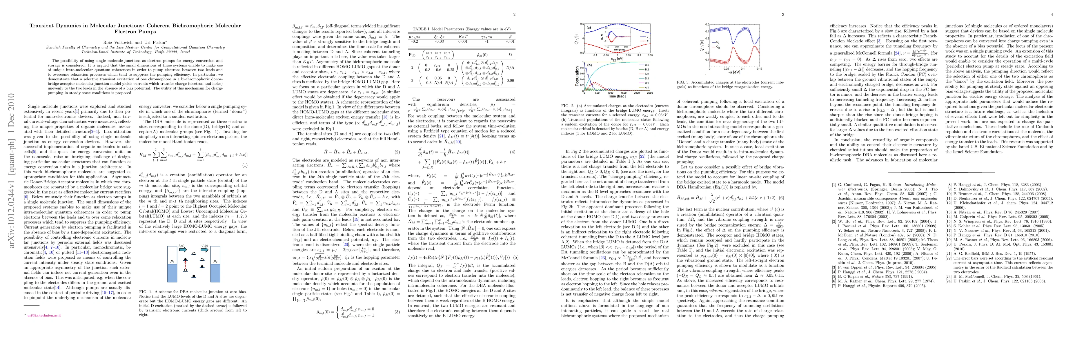 The possibility of using single molecule junctions as electron pumps for energy conversion and storage is considered. It is argued that the small dimensions of these systems enable to make use of unique intra-molecular quantum coherences in order to pump electrons between two leads and to overcome relaxation processes which tend to suppress the pumping efficiency. In particular, we demonstrate that a selective transient excitation of one chromophore in a bi-chromophoric donor-bridge-acceptor molecular junction model yields currents which transfer charge (electron and holes) unevenly to the two leads in the absence of a bias potential. The utility of this mechanism for charge pumping in steady state conditions is proposed.