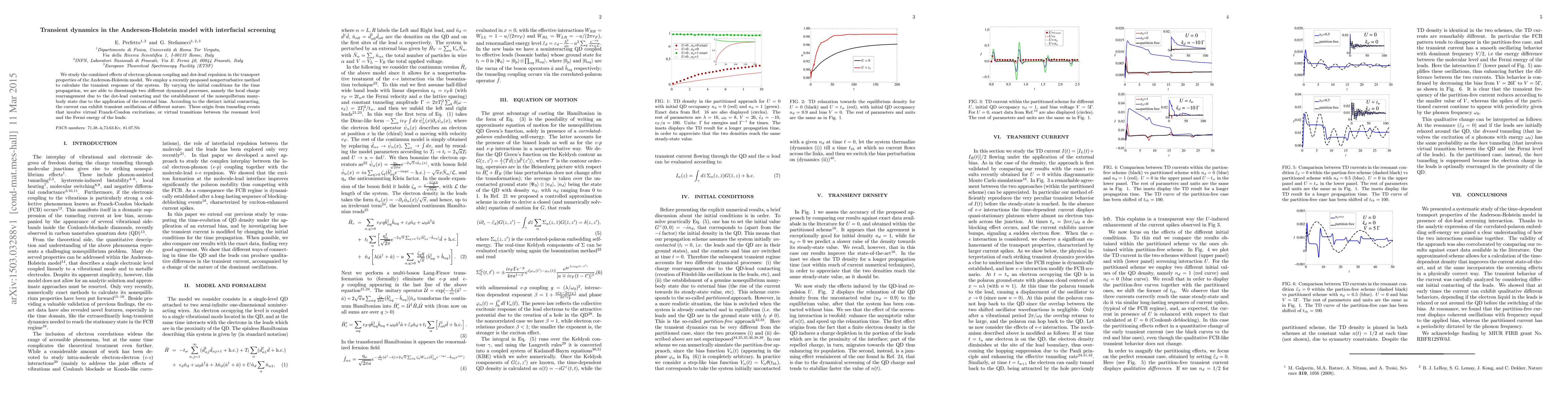 We study the combined effects of electron-phonon coupling and dot-lead repulsion in the transport properties of the Anderson-Holstein model. We employ a recently proposed nonperturbative method to calculate the transient response of the system. By varying the initial conditions for the time propagation the current exhibits transient oscillations of different nature. We are able to disentangle two dynamical processes, namely the local charge rearrangement due to the dot-lead contacting and the establishment of the nonequilbrium many-body state due to the application of the external bias. These processes involve either Franck-Condon excitations or transitions between the resonant level and the Fermi energy of the leads.