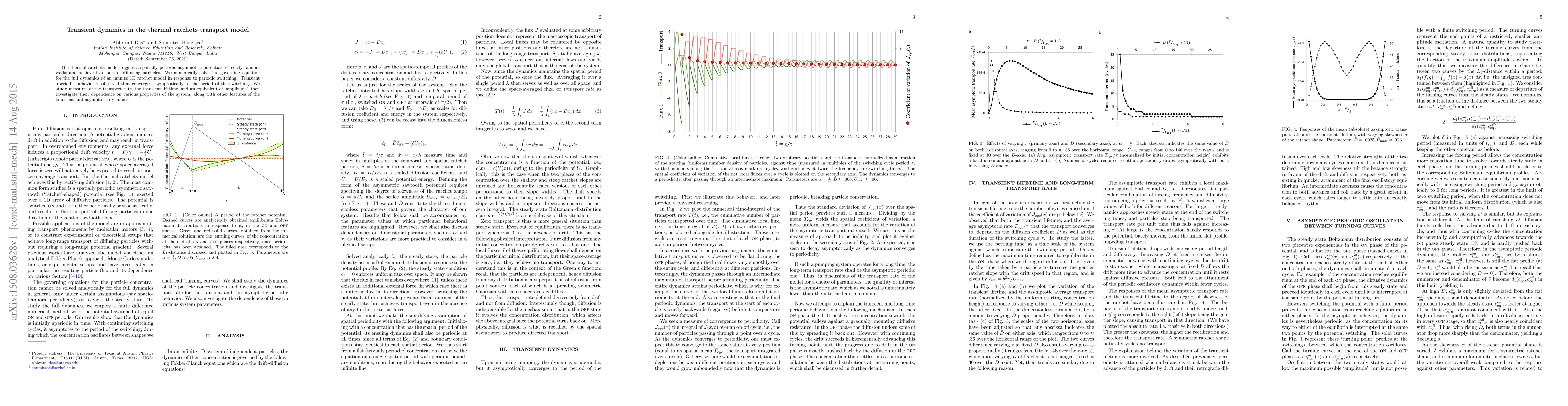 The thermal ratchets model toggles a spatially periodic asymmetric potential to rectify random walks and achieve transport of diffusing particles. We numerically solve the governing equation for the full dynamics of an infinite 1D ratchet model in response to periodic switching. Transient aperiodic behavior is observed that converges asymptotically to the period of the switching. We study measures of the transport rate, the transient lifetime, and an equivalent of `amplitude', then investigate their dependence on various properties of the system, along with other features of the transient and asymptotic dynamics.