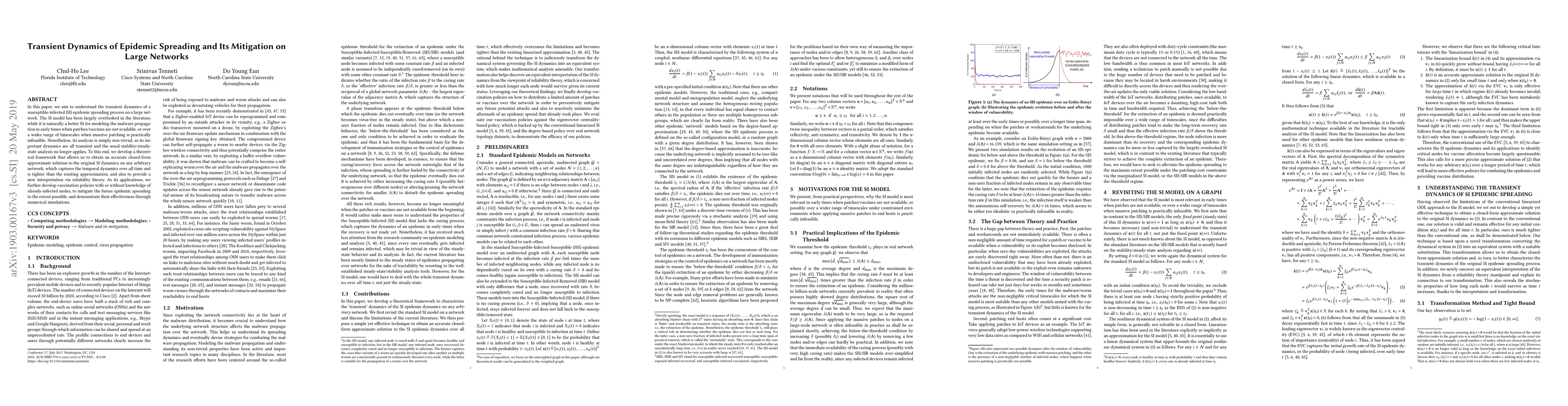 In this paper, we aim to understand the transient dynamics of a susceptible-infected (SI) epidemic spreading process on a large network. The SI model has been largely overlooked in the literature, while it is naturally a better fit for modeling the malware propagation in early times when patches/vaccines are not available, or over a wider range of timescales when massive patching is practically infeasible. Nonetheless, its analysis is simply non-trivial, as its important dynamics are all transient and the usual stability/steady-state analysis no longer applies. To this end, we develop a theoretical framework that allows us to obtain an accurate closed-form approximate solution to the original SI dynamics on any arbitrary network, which captures the temporal dynamics over all time and is tighter than the existing approximation, and also to provide a new interpretation via reliability theory. As its applications, we further develop vaccination policies with or without knowledge of already-infected nodes, to mitigate the future epidemic spreading to the extent possible, and demonstrate their effectiveness through numerical simulations.