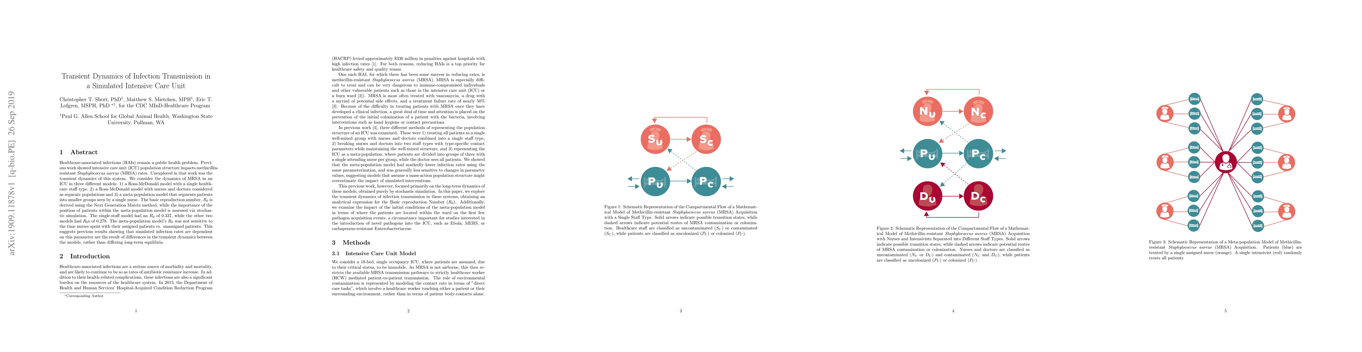 Healthcare-associated infections (HAIs) remain a public health problem. Previous work showed intensive care unit (ICU) population structure impacts methicillin-resistant Staphylococcus aureus (MRSA) rates. Unexplored in that work was the transient dynamics of this system. We consider the dynamics of MRSA in an ICU in three different models: 1) a Ross-McDonald model with a single healthcare staff type, 2) a Ross-McDonald model with nurses and doctors considered as separate populations and 3) a meta-population model that segments patients into smaller groups seen by a single nurse. The basic reproduction number, R0 is derived using the Next Generation Matrix method, while the importance of the position of patients within the meta-population model is assessed via stochastic simulation. The single-staff model had an R0 of 0.337, while the other two models had R0s of 0.278. The meta-population model's R0 was not sensitive to the time nurses spent with their assigned patients vs. unassigned patients. This suggests previous results showing that simulated infection rates are dependent on this parameter are the result of differences in the transient dynamics between the models, rather than differing long-term equilibria.