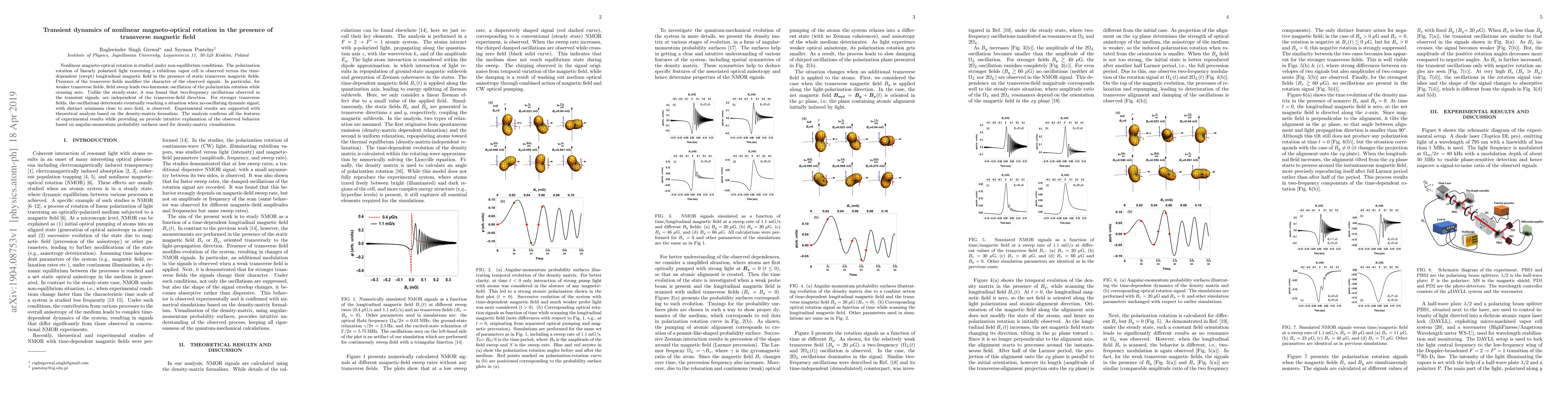 Nonlinear magneto-optical rotation is studied under non-equilibrium conditions. The polarization rotation of linearly polarized light traversing a rubidium vapor cell is observed versus the time-dependent (swept) longitudinal magnetic field in the presence of static transverse magnetic fields. Presence of the transverse fields modifies the character of the observed signals. In particular, for weaker transverse fields, field sweep leads two-harmonic oscillation of the polarization rotation while crossing zero. Unlike the steady-state, it was found that two-frequency oscillations observed in the transient signals, are independent of the transverse-field direction. For stronger transverse fields, the oscillations deteriorate eventually reaching a situation when no-oscillating dynamic signal, with distinct minimum close to zero field, is observed. Experimental results are supported with theoretical analysis based on the density-matrix formalism. The analysis confirms all the features of experimental results while providing an provide intuitive explanation of the observed behavior based on angular-momentum probability surfaces used for density-matrix visualization.
