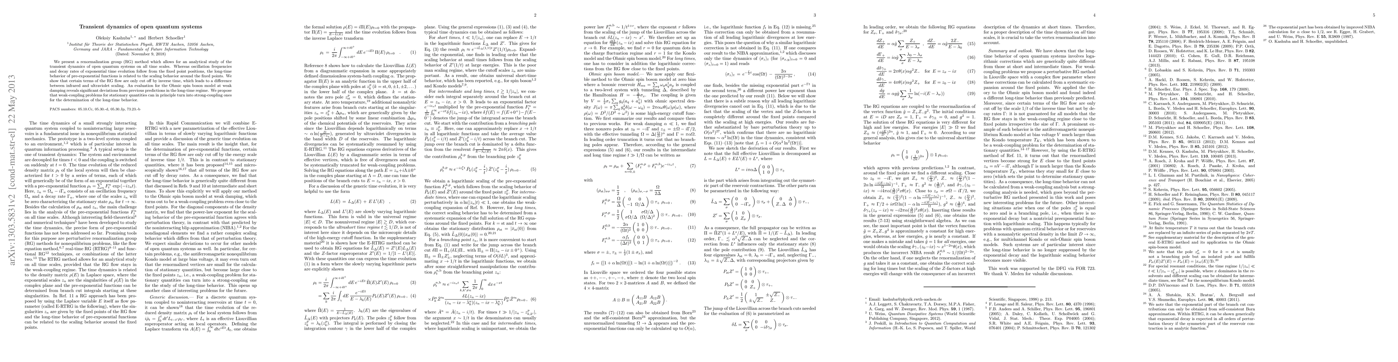 This paper introduces a renormalization group method to analyze the transient dynamics of open quantum systems across all time scales, revealing deviations from previous predictions in long-time behavior for the ohmic spin boson model, particularly in weak damping scenarios. The study highlights the difference between infrared and ultraviolet scaling and suggests a shift from weak to strong coupling in determining long-time dynamics.