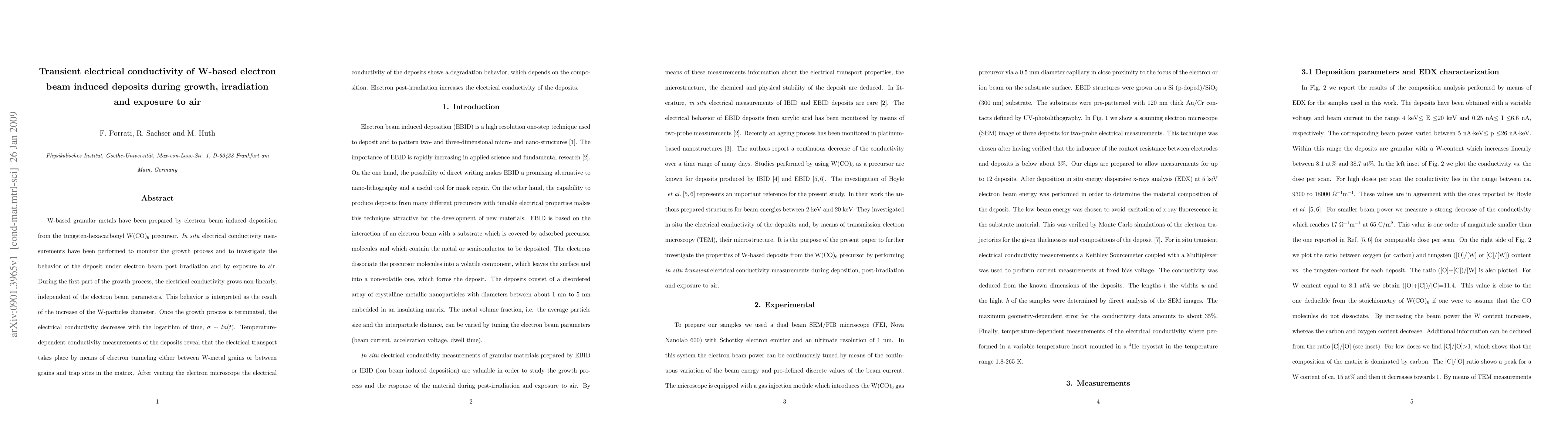 W-based granular metals have been prepared by electron beam induced deposition from the tungsten-hexacarbonyl W(CO)6 precursor. In situ electrical conductivity measurements have been performed to monitor the growth process and to investigate the behavior of the deposit under electron beam post irradiation and by exposure to air. During the first part of the growth process, the electrical conductivity grows non-linearly, independent of the electron beam parameters. This behavior is interpreted as the result of the increase of the W-particles diameter. Once the growth process is terminated, the electrical conductivity decreases with the logarithm of time, sigma ln(t). Temperature-dependent conductivity measurements of the deposits reveal that the electrical transport takes place by means of electron tunneling either between W-metal grains or between grains and trap sites in the matrix. After venting the electron microscope the electrical conductivity of the deposits shows a degradation behavior, which depends on the composition. Electron post-irradiation increases the electrical conductivity of the deposits.