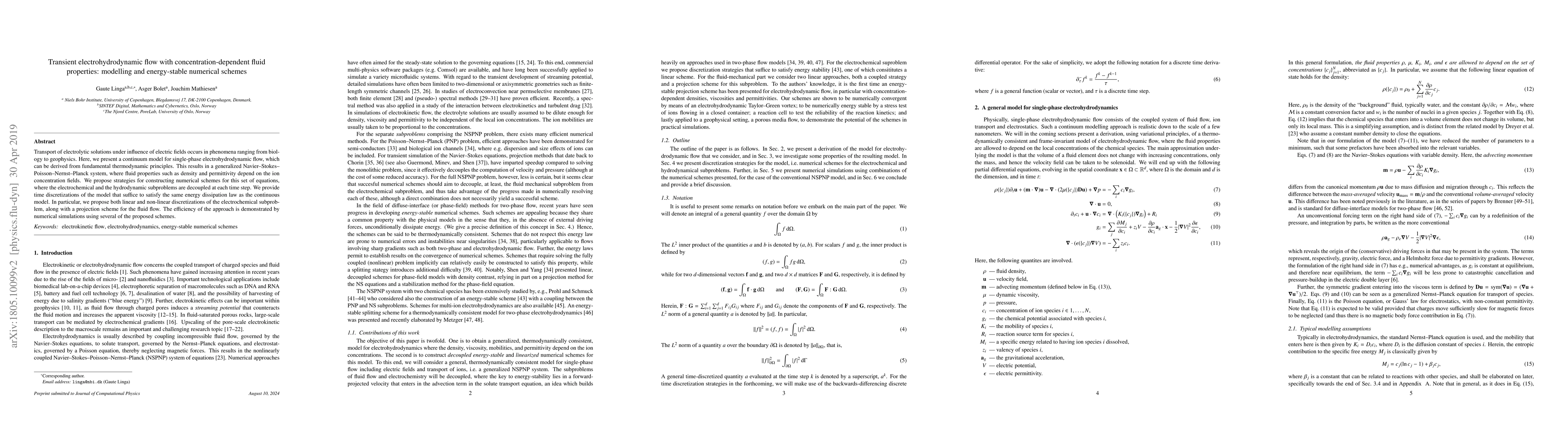 This paper develops a continuum model for electrohydrodynamic flow of electrolytic solutions under electric fields, incorporating concentration-dependent fluid properties. It proposes numerical schemes that decouple electrochemical and hydrodynamic subproblems, ensuring energy stability and demonstrating efficiency through simulations.