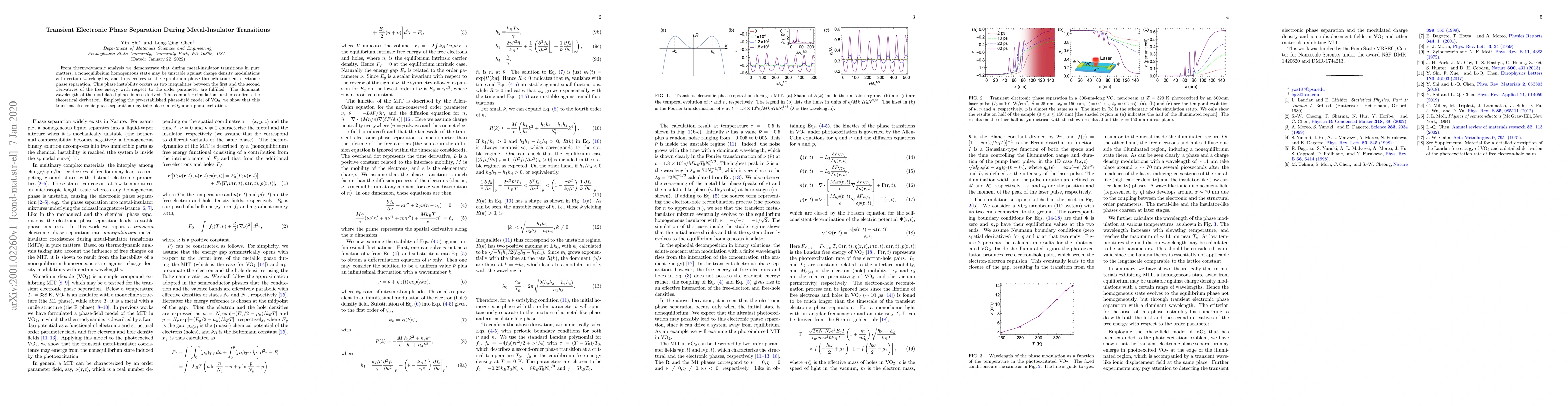 From thermodynamic analysis we demonstrate that during metal-insulator transitions in pure matters, a nonequilibrium homogeneous state may be unstable against charge density modulations with certain wavelengths, and thus evolves to the equilibrium phase through transient electronic phase separation. This phase instability occurs as two inequalities between the first and the second derivatives of the free energy with respect to the order parameter are fulfilled. The dominant wavelength of the modulated phase is also derived. The computer simulation further confirms the theoretical derivation. Employing the pre-established phase-field model of VO$_2$, we show that this transient electronic phase separation may take place in VO$_2$ upon photoexcitation.