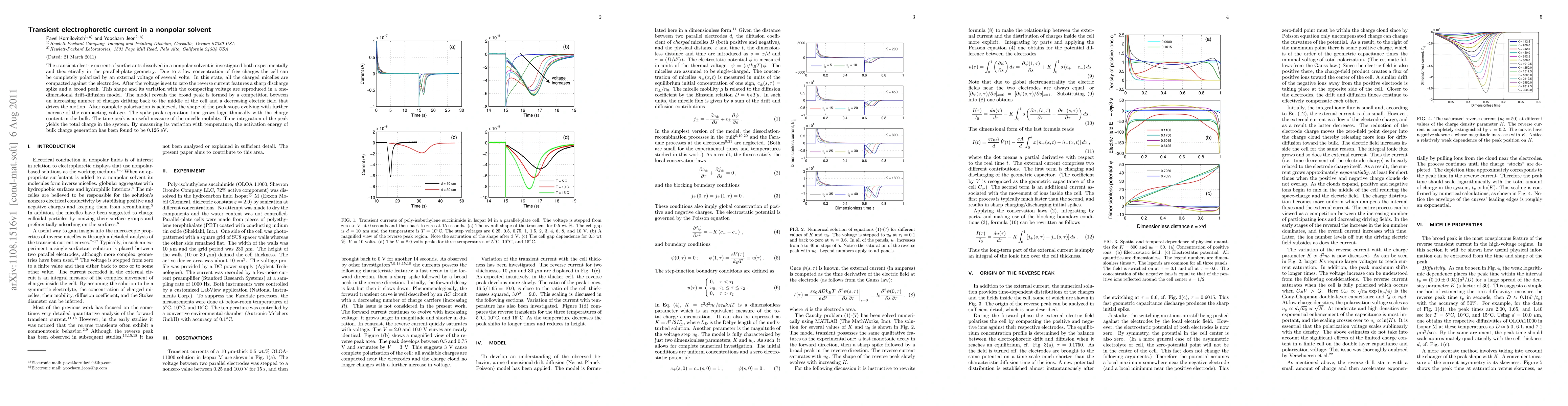 The transient electric current of surfactants dissolved in a nonpolar solvent is investigated both experimentally and theoretically in the parallel-plate geometry. Due to a low concentration of free charges the cell can be completely polarized by an external voltage of several volts. In this state, all the charged micelles are compacted against the electrodes. After the voltage is set to zero the reverse current features a sharp discharge spike and a broad peak. This shape and its variation with the compacting voltage are reproduced in a one-dimensional drift-diffusion model. The model reveals the broad peak is formed by a competition between an increasing number of charges drifting back to the middle of the cell and a decreasing electric field that drives the motion. After complete polarization is achieved, the shape of the peak stops evolving with further increase of the compacting voltage. The spike-peak separation time grows logarithmically with the charge content in the bulk. The time peak is a useful measure of the micelle mobility. Time integration of the peak yields the total charge in the system. By measuring its variation with temperature, the activation energy of bulk charge generation has been found to be 0.126 eV.