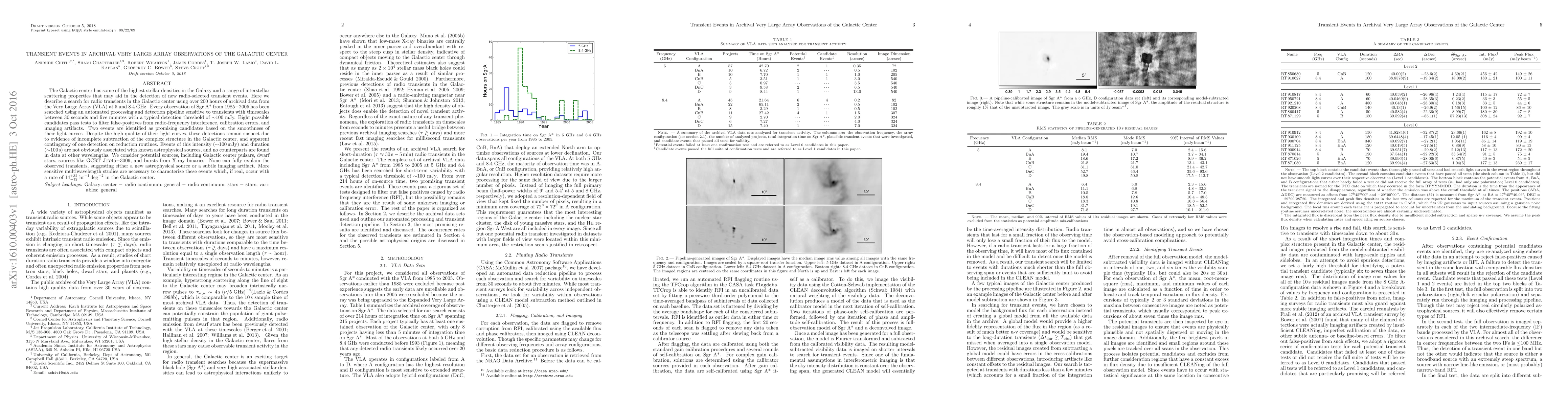 The Galactic center has some of the highest stellar densities in the Galaxy and a range of interstellar scattering properties that may aid in the detection of new radio-selected transient events. Here we describe a search for radio transients in the Galactic center using over 200 hours of archival data from the Very Large Array (VLA) at 5 and 8.4 GHz. Every observation of SgrA* from 1985$-$2005 has been searched using an automated processing and detection pipeline sensitive to transients with timescales between 30 seconds and five minutes with a typical detection threshold of $\sim$100 mJy. Eight possible candidates pass tests to filter false-positives from radio-frequency interference, calibration errors, and imaging artifacts. Two events are identified as promising candidates based on the smoothness of their light curves. Despite the high quality of their light curves, these detections remain suspect due to evidence of incomplete subtraction of the complex structure in the Galactic center, and apparent contingency of one detection on reduction routines. Events of this intensity ($\sim$100 mJy) and duration ($\sim$100 s) are not obviously associated with known astrophysical sources, and no counterparts are found in data at other wavelengths. We consider potential sources, including Galactic center pulsars, dwarf stars, sources like GCRT J1745-3009, and bursts from X-ray binaries. None can fully explain the observed transients, suggesting either a new astrophysical source or a subtle imaging artifact. More sensitive multiwavelength studies are necessary to characterize these events which, if real, occur with a rate of $14^{+32}_{-12}~{\rm hr}^{-1}\,{\rm deg}^{-2}$ in the Galactic center.