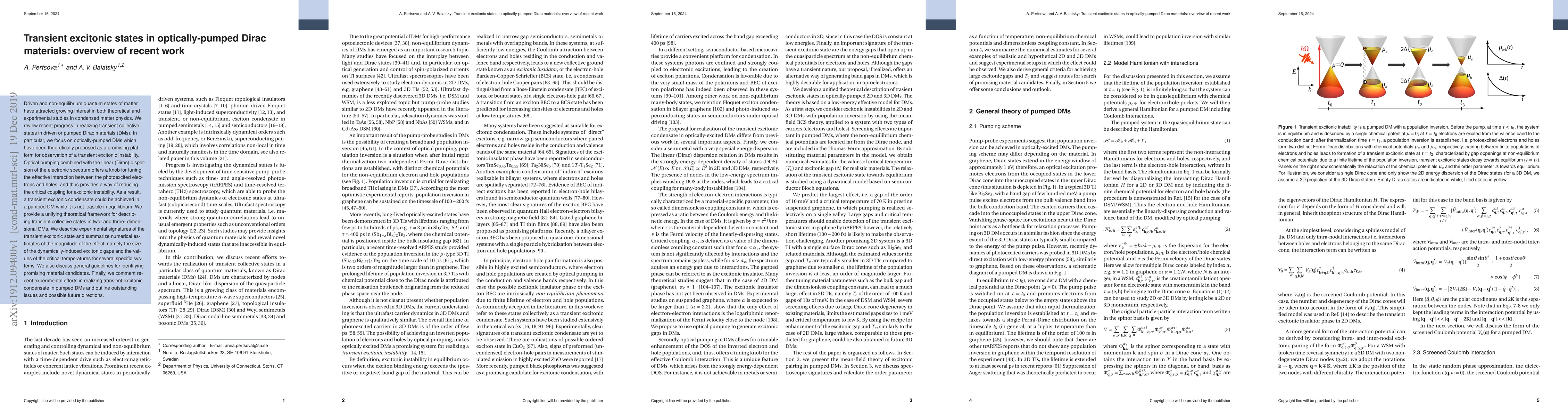 This paper reviews recent advancements in transient collective states in optically-pumped Dirac materials, proposing them as a platform for transient excitonic instabilities. It provides a theoretical framework to describe these states and discusses experimental signatures, the size of dynamically-induced excitonic gaps, and potential material candidates for future studies.
