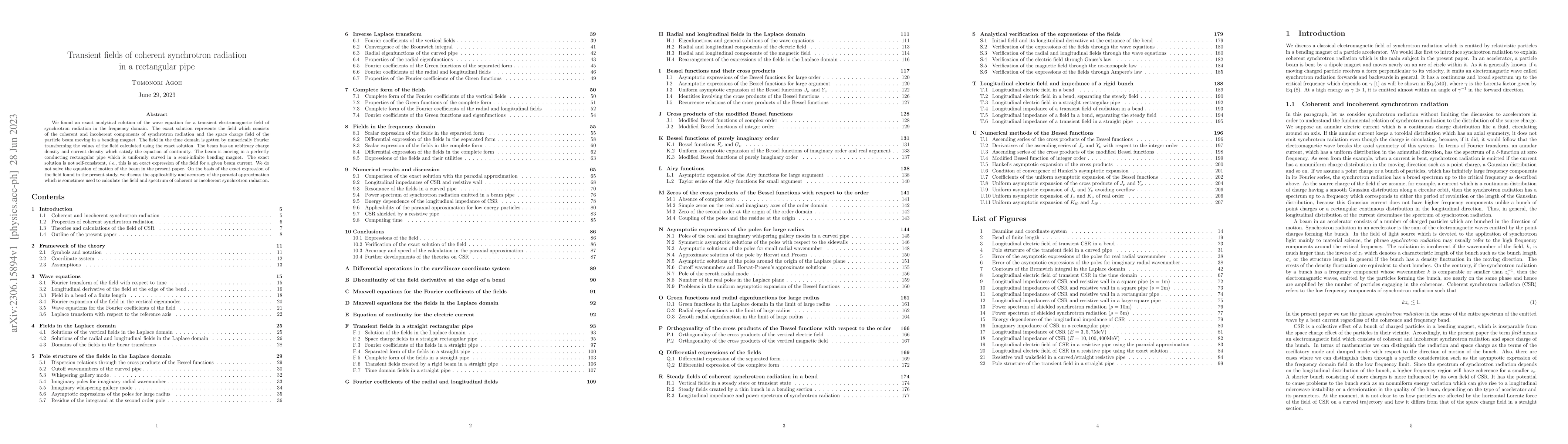 We found an exact analytical solution of the wave equation for a transient electromagnetic field of synchrotron radiation in the frequency domain. The exact solution represents the field which consists of the coherent and incoherent components of synchrotron radiation and the space charge field of the particle beam moving in a bending magnet. The field in the time domain is gotten by numerically Fourier transforming the values of the field calculated using the exact solution. The beam has an arbitrary charge density and current density which satisfy the equation of continuity. The beam is moving in a perfectly conducting rectangular pipe which is uniformly curved in a semi-infinite bending magnet. The exact solution is not self-consistent, i.e., this is an exact expression of the field for a given beam current. We do not solve the equation of motion of the beam in the present paper. On the basis of the exact expression of the field found in the present study, we discuss the applicability and accuracy of the paraxial approximation which is sometimes used to calculate the field and spectrum of coherent or incoherent synchrotron radiation.