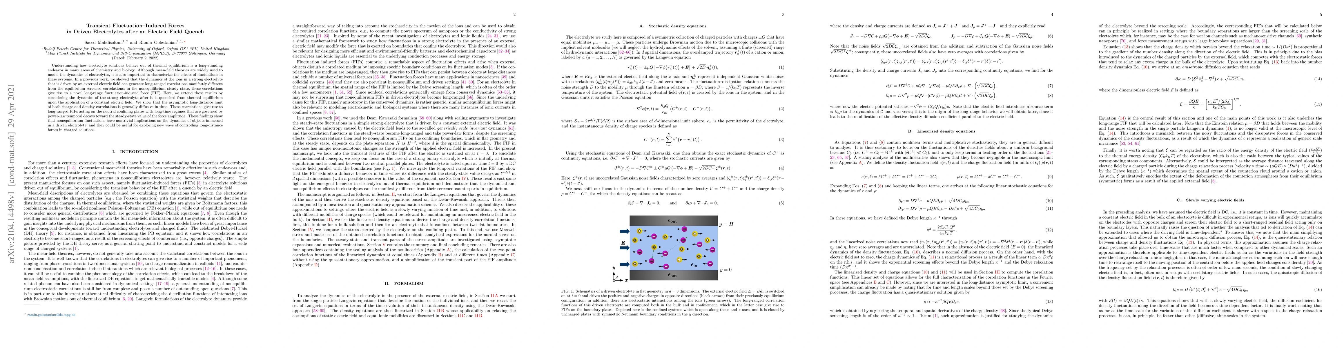 Understanding how electrolyte solutions behave out of thermal equilibrium is a long-standing endeavor in many areas of chemistry and biology. Although mean-field theories are widely used to model the dynamics of electrolytes, it is also important to characterize the effects of fluctuations in these systems. In a previous work, we showed that the dynamics of the ions in a strong electrolyte that is driven by an external electric field can generate long-ranged correlations manifestly different from the equilibrium screened correlations; in the nonequilibrium steady state, these correlations give rise to a novel long-range fluctuation-induced force (FIF). Here, we extend these results by considering the dynamics of the strong electrolyte after it is quenched from thermal equilibrium upon the application of a constant electric field. We show that the asymptotic long-distance limit of both charge and density correlations is generally diffusive in time. These correlations give rise to long-ranged FIFs acting on the neutral confining plates with long-time regimes that are governed by power-law temporal decays toward the steady-state value of the force amplitude. These findings show that nonequilibrium fluctuations have nontrivial implications on the dynamics of objects immersed in a driven electrolyte, and they could be useful for exploring new ways of controlling long-distance forces in charged solutions.