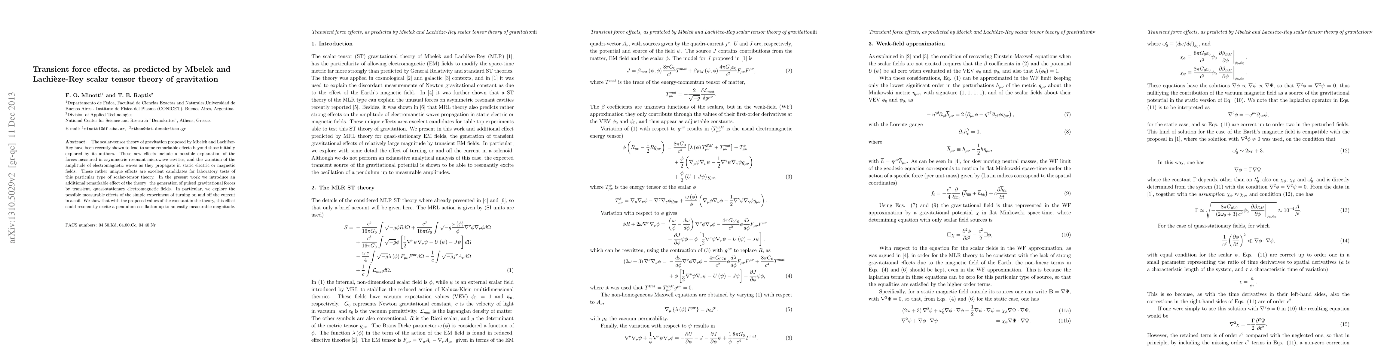 This paper explores transient force effects predicted by Mbelek and Lachièze-Rey's scalar-tensor theory of gravitation, demonstrating that it can generate pulsed gravitational forces from transient electromagnetic fields. The study suggests that turning on and off a coil's current could resonantly excite pendulum oscillations, providing a testable prediction of the theory.