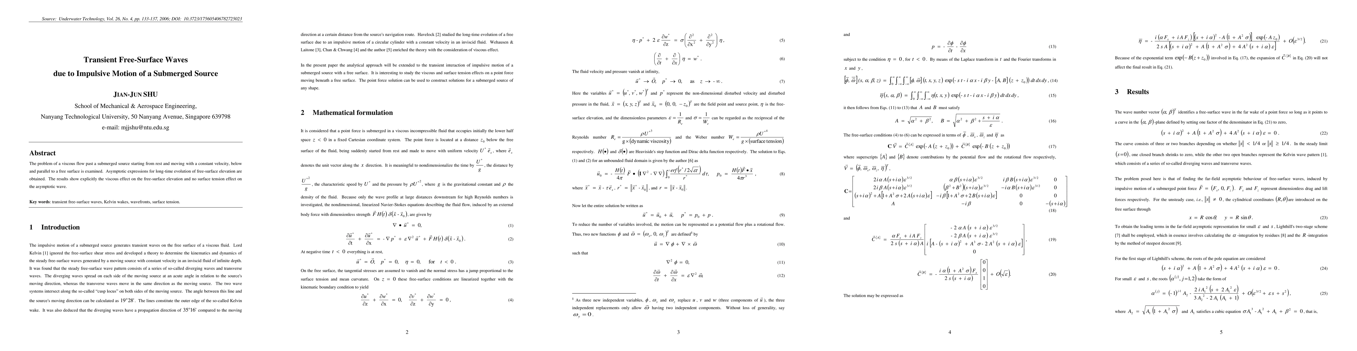 This paper investigates the transient free-surface waves generated by a viscous flow around a submerged source that impulsively starts moving with a constant velocity beneath a free surface. It derives asymptotic expressions for long-term free-surface elevation, highlighting the influence of viscosity without considering surface tension effects.