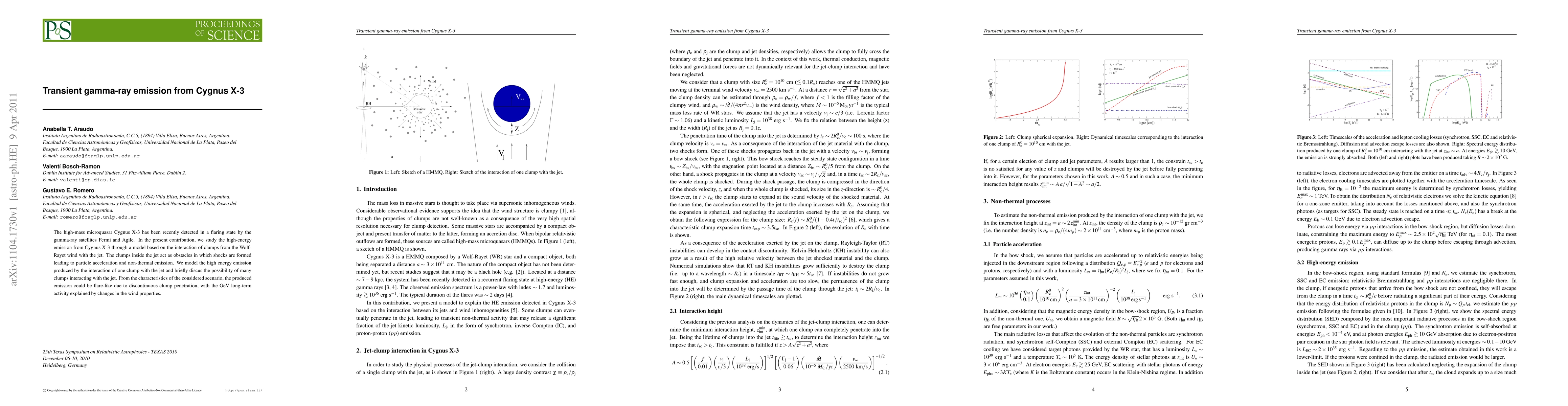 The paper investigates the transient gamma-ray emission from Cygnus X-3, attributing it to the interaction of clumps from the Wolf-Rayet wind with the jet, leading to shock formation, particle acceleration, and non-thermal emission. The model suggests that flare-like GeV emissions result from the discontinuous penetration of clumps, with long-term activity linked to wind property changes.