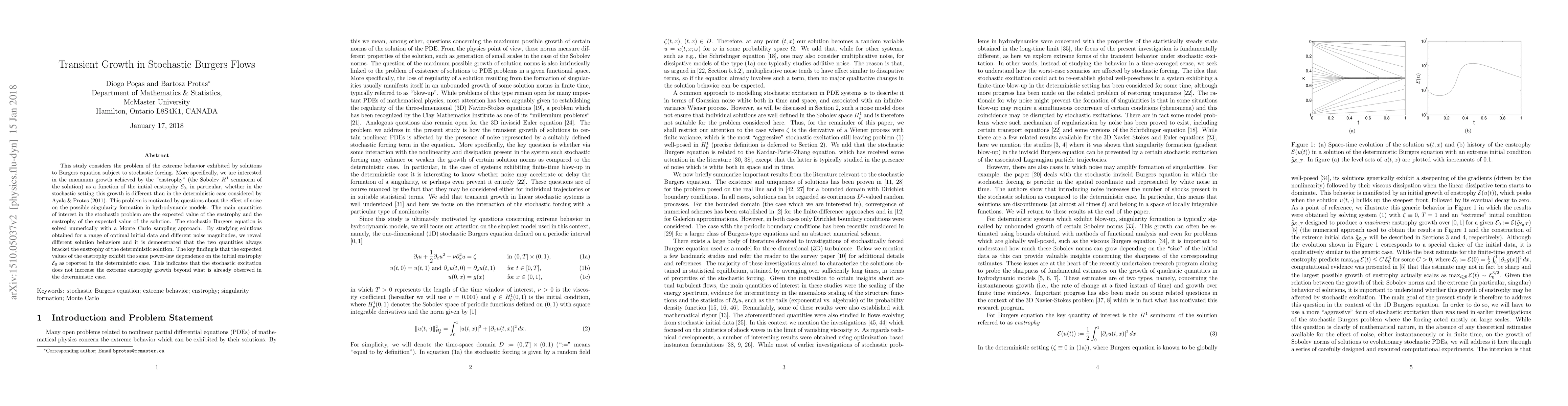This study investigates the extreme behavior of stochastic Burgers flows, focusing on the maximum enstrophy growth influenced by stochastic forcing. It finds that the expected enstrophy values maintain a power-law dependence on initial enstrophy similar to the deterministic case, indicating that stochastic excitation does not enhance extreme growth beyond deterministic observations.
