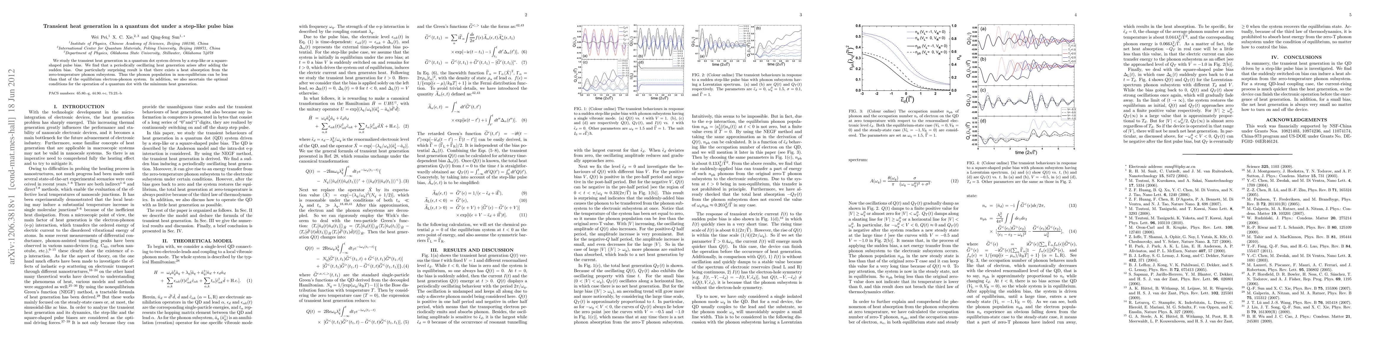 This study investigates the transient heat generation in a quantum dot subjected to a step-like pulse bias, revealing periodic oscillations and unexpected heat absorption from the phonon subsystem. The research also identifies optimal conditions for minimal heat generation in quantum dot operations.
