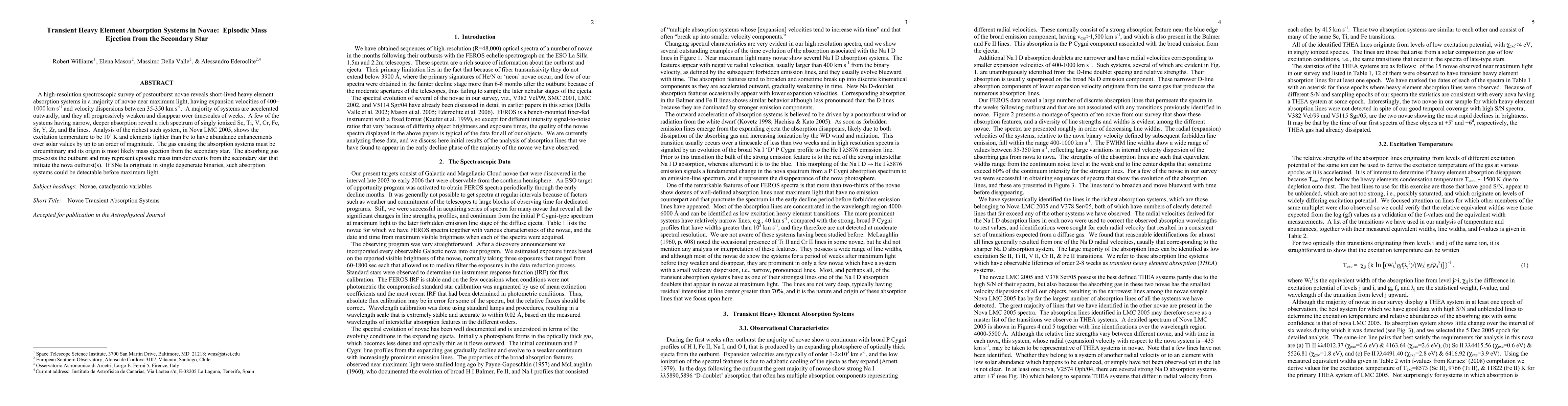 A high-resolution spectroscopic survey of postoutburst novae reveals short-lived heavy element absorption systems in a majority of novae near maximum light, having expansion velocities of 400-1000 km/s and velocity dispersions between 35-350 km/s. A majority of systems are accelerated outwardly, and they all progressively weaken and disappear over timescales of weeks. A few of the systems having narrow, deeper absorption reveal a rich spectrum of singly ionized Sc, Ti, V, Cr, Fe, Sr, Y, Zr, and Ba lines. Analysis of the richest such system, in Nova LMC 2005, shows the excitation temperature to be 104 K and elements lighter than Fe to have abundance enhancements over solar values by up to an order of magnitude. The gas causing the absorption systems must be circumbinary and its origin is most likely mass ejection from the secondary star. The absorbing gas pre-exists the outburst and may represent episodic mass transfer events from the secondary star that initiate the nova outburst(s). If SNe Ia originate in single degenerate binaries, such absorption systems could be detectable before maximum light