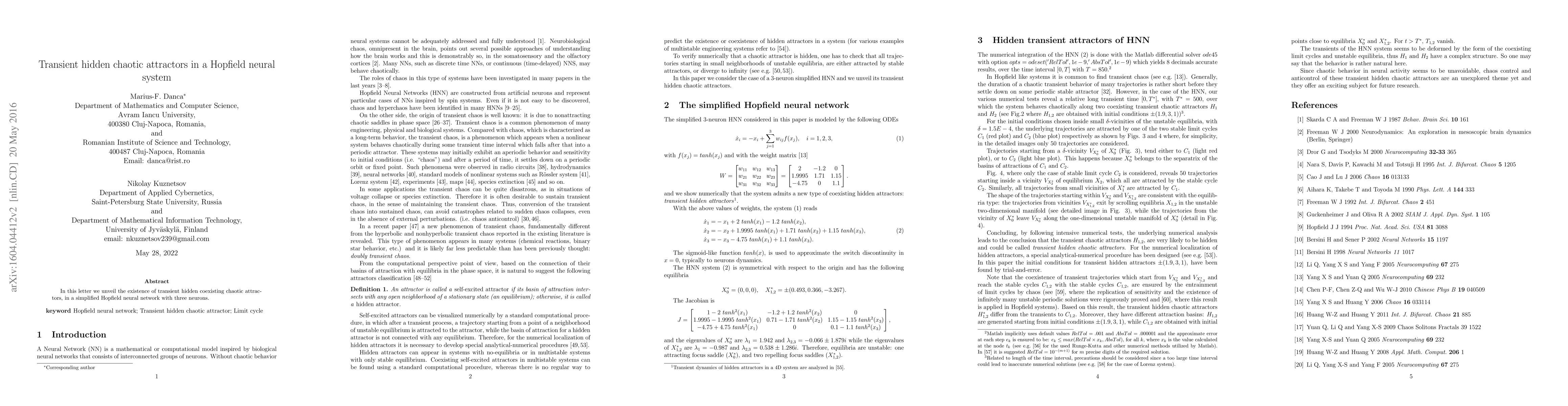 This research reveals transient hidden chaotic attractors in a simplified three-neuron Hopfield neural network, demonstrating the complexity of dynamical behavior in neural systems. The study highlights coexisting chaotic dynamics that emerge transiently in the network.