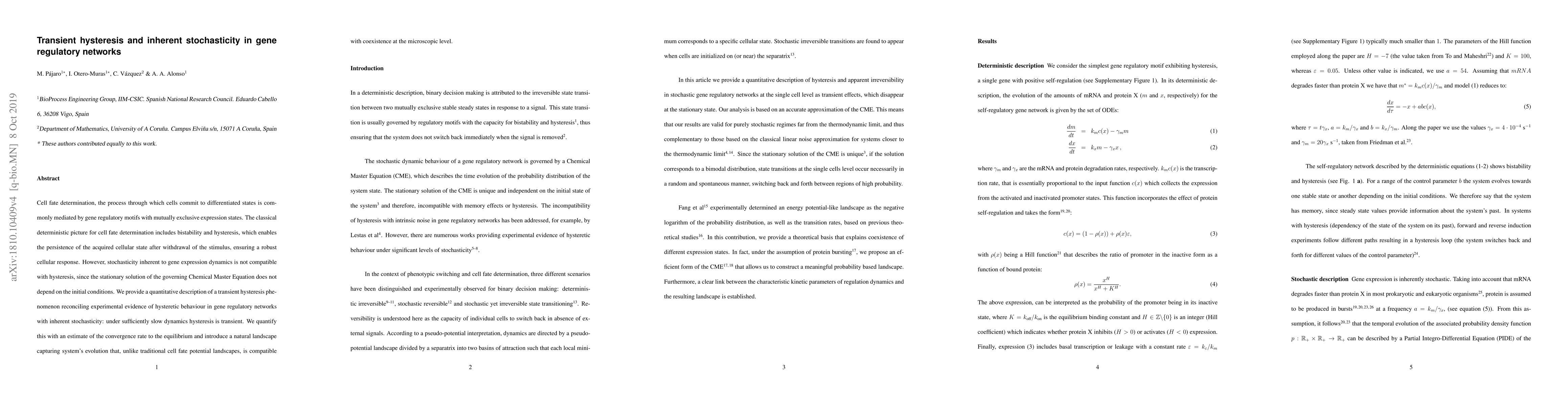 Cell fate determination, the process through which cells commit to differentiated states is commonly mediated by gene regulatory motifs with mutually exclusive expression states. The classical deterministic picture for cell fate determination includes bistability and hysteresis, which enables the persistence of the acquired cellular state after withdrawal of the stimulus, ensuring a robust cellular response. However, the stochasticity inherent to gene expression dynamics is not compatible with hysteresis, since the stationary solution of the governing Chemical Master Equation does not depend on the initial conditions. In this work, we provide a quantitative description of a transient hysteresis phenomenon that reconciles experimental evidence of hysteretic behaviour in gene regulatory networks with their inherent stochasticity. Under sufficiently slow dynamics, the dependency of the non-stationary solutions on the initial state of the cells can lead to what we denote here as transient hysteresis. To quantify this phenomenon, we provide an estimate of the convergence rate to the equilibrium. We also introduce the equation of a natural landscape capturing the evolution of the system that, unlike traditional cell fate potential landscapes, is compatible with the notion of coexistence at the microscopic level.