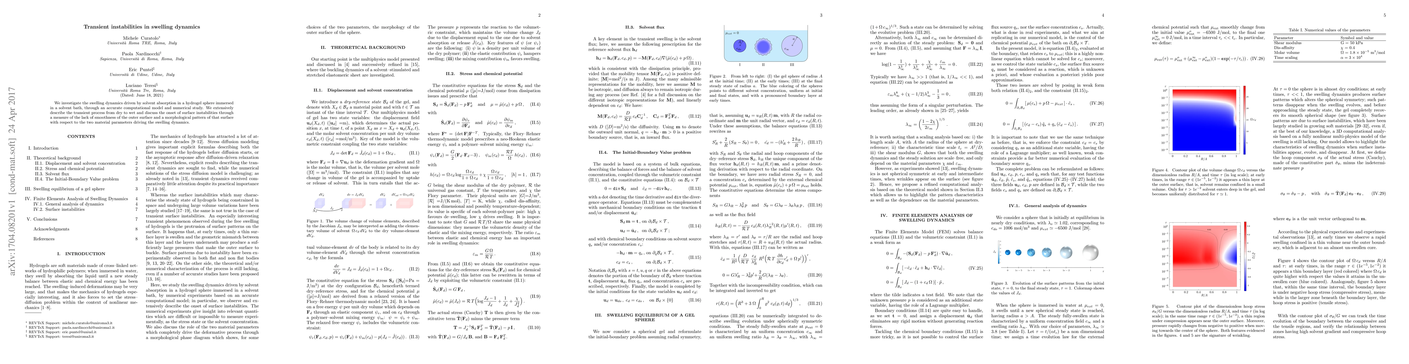 This paper examines the transient swelling dynamics in hydrogel spheres due to solvent absorption, employing a detailed computational model. It investigates the emergence of surface instabilities during the swelling process, correlating these with key material parameters.
