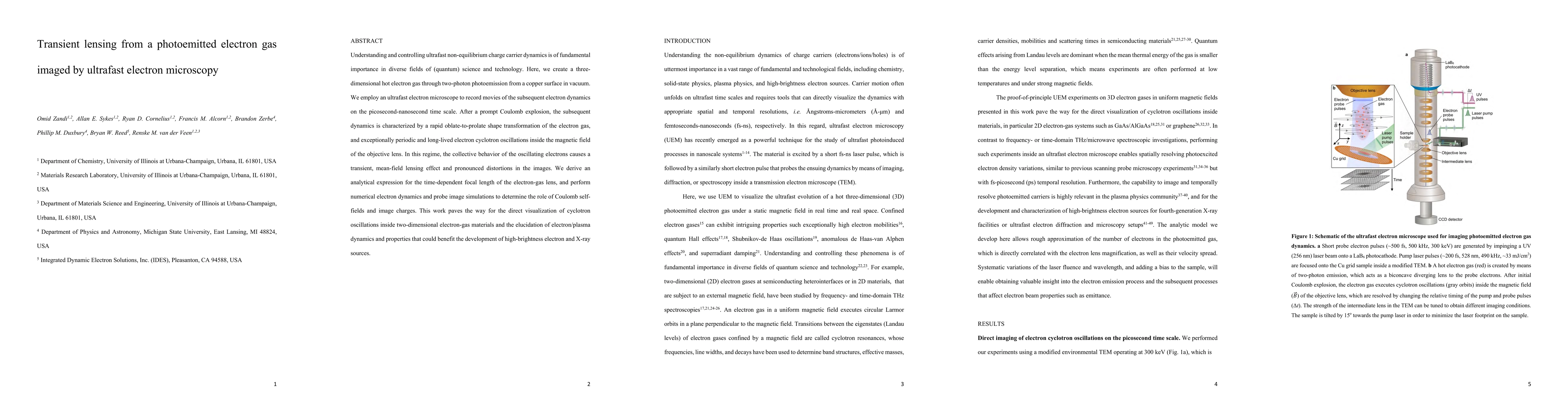 This paper investigates transient lensing effects caused by a photoemitted electron gas imaged via ultrafast electron microscopy, revealing the dynamics of electron cyclotron oscillations and their impact on image formation. The study provides an analytical model for the time-dependent focal length and highlights the potential for advanced electron and X-ray source development.