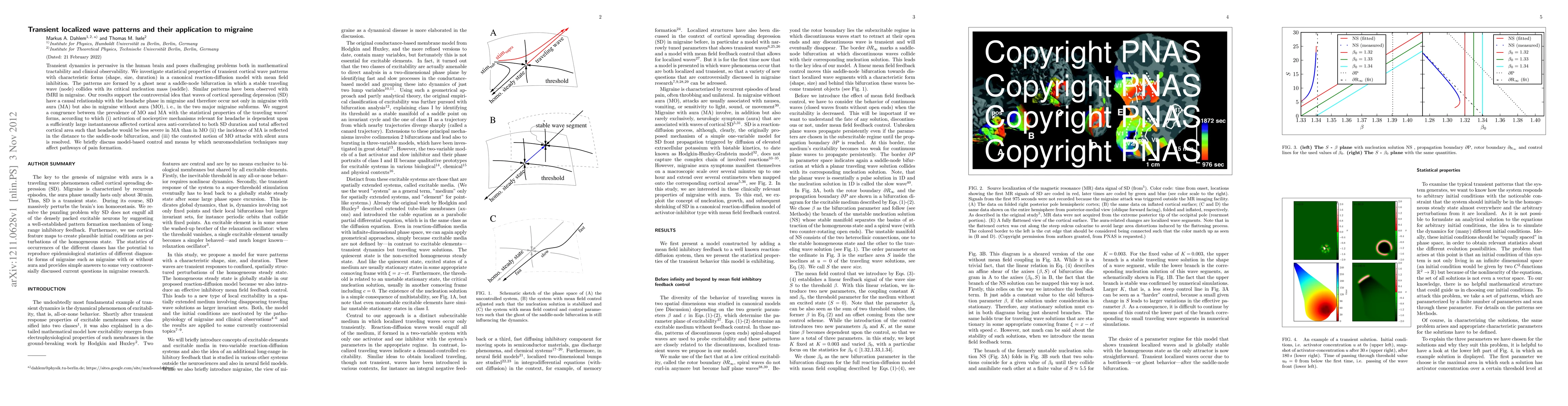 Transient dynamics is pervasive in the human brain and poses challenging problems both in mathematical tractability and clinical observability. We investigate statistical properties of transient cortical wave patterns with characteristic forms (shape, size, duration) in a canonical reaction-diffusion model with mean field inhibition. The patterns are formed by a ghost near a saddle-node bifurcation in which a stable traveling wave (node) collides with its critical nucleation mass (saddle). Similar patterns have been observed with fMRI in migraine. Our results support the controversial idea that waves of cortical spreading depression (SD) have a causal relationship with the headache phase in migraine and therefore occur not only in migraine with aura (MA) but also in migraine without aura (MO), i.e., in the two major migraine subforms. We suggest a congruence between the prevalence of MO and MA with the statistical properties of the traveling waves' forms, according to which (i) activation of nociceptive mechanisms relevant for headache is dependent upon a sufficiently large instantaneous affected cortical area anti-correlated to both SD duration and total affected cortical area such that headache would be less severe in MA than in MO (ii) the incidence of MA is reflected in the distance to the saddle-node bifurcation, and (iii) the contested notion of MO attacks with silent aura is resolved. We briefly discuss model-based control and means by which neuromodulation techniques may affect pathways of pain formation.