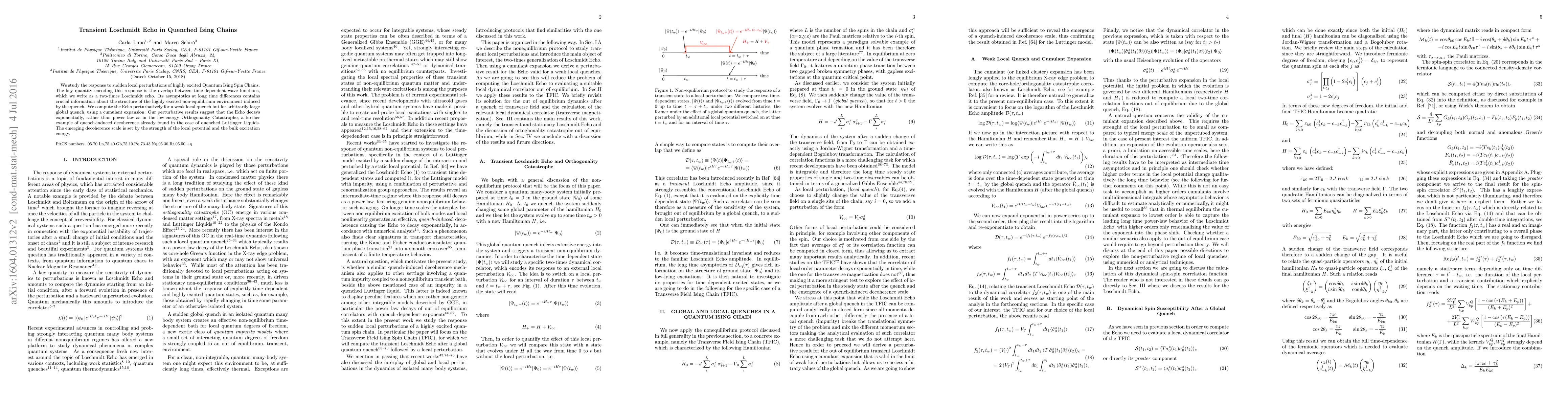 We study the response to sudden local perturbations of highly excited Quantum Ising Spin Chains. The key quantity encoding this response is the overlap between time-dependent wave functions, which we write as a two-times Loschmidt echo. Its asymptotics at long time differences contains crucial information about the structure of the highly excited non-equilibrium environment induced by the quench. We compute the Echo perturbatively for a weak local quench but for arbitrarily large global quench, using a cumulant expansion. Our perturbative results suggest that the Echo decays exponentially, rather than power law as in the low-energy Orthogonality Catastrophe, a further example of quench-induced decoherence already found in the case of quenched Luttinger Liquids. The emerging decoherence scale is set by the strenght of the local potential and the bulk excitation energy.