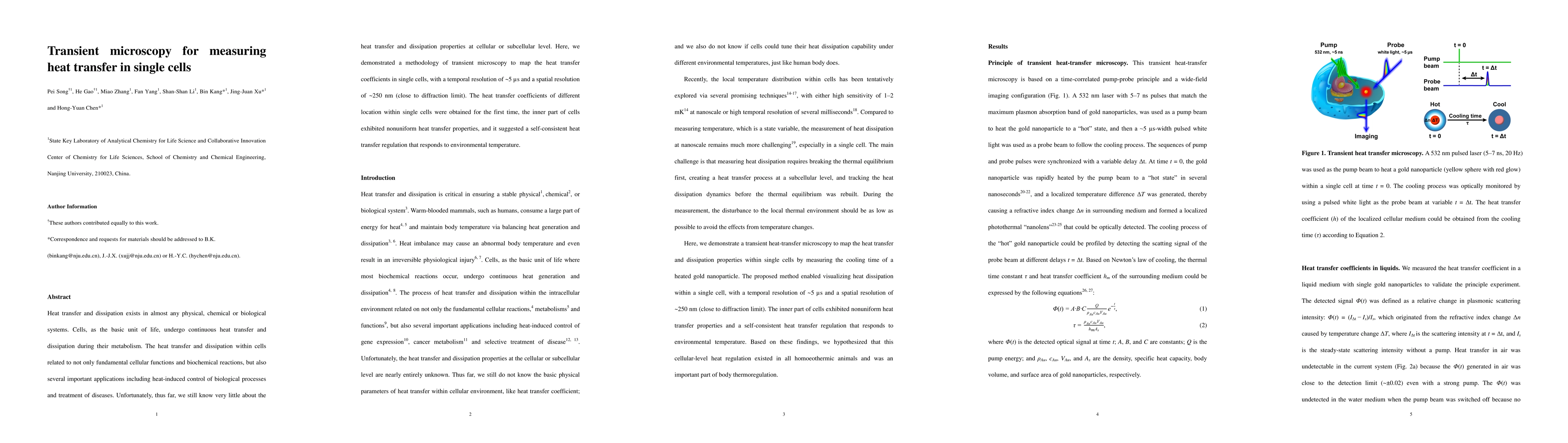 This paper introduces transient microscopy to measure heat transfer in single cells, achieving a temporal resolution of ~5 us and a spatial resolution of ~250 nm. For the first time, it maps heat transfer coefficients within cells, revealing nonuniform properties and suggesting a self-consistent regulation in response to temperature changes.
