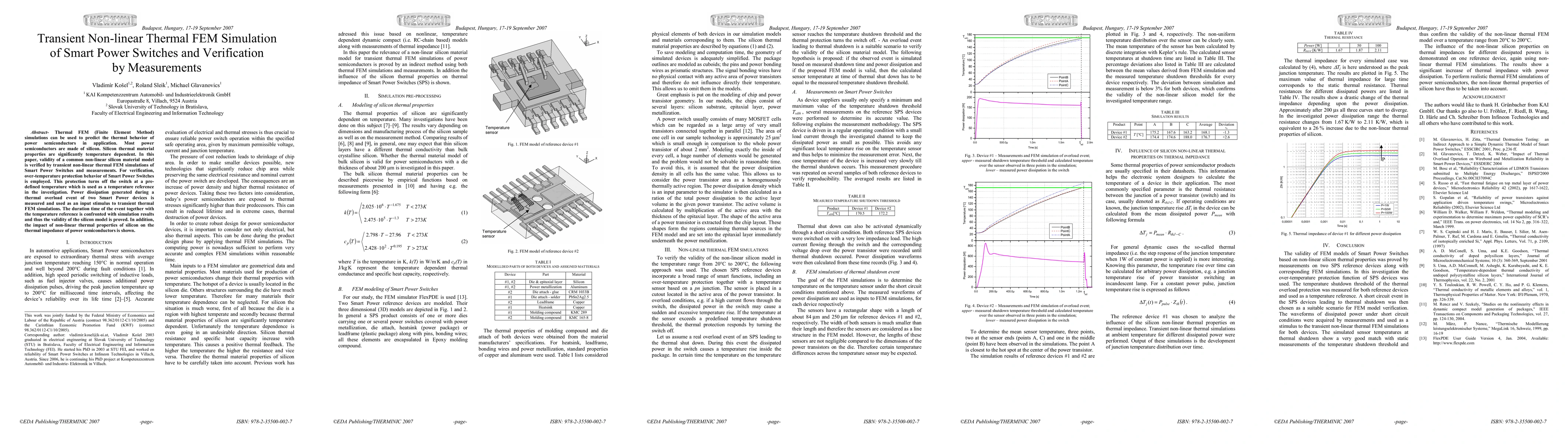 Thermal FEM (Finite Element Method) simulations can be used to predict the thermal behavior of power semiconductors in application. Most power semiconductors are made of silicon. Silicon thermal material properties are significantly temperature dependent. In this paper, validity of a common non-linear silicon material model is verified by transient non-linear thermal FEM simulations of Smart Power Switches and measurements. For verification, over-temperature protection behavior of Smart Power Switches is employed. This protection turns off the switch at a pre-defined temperature which is used as a temperature reference in the investigation. Power dissipation generated during a thermal overload event of two Smart Power devices is measured and used as an input stimulus to transient thermal FEM simulations. The duration time of the event together with the temperature reference is confronted with simulation results and thus the validity of the silicon model is proved. In addition, the impact of non-linear thermal properties of silicon on the thermal impedance of power semiconductors is shown.