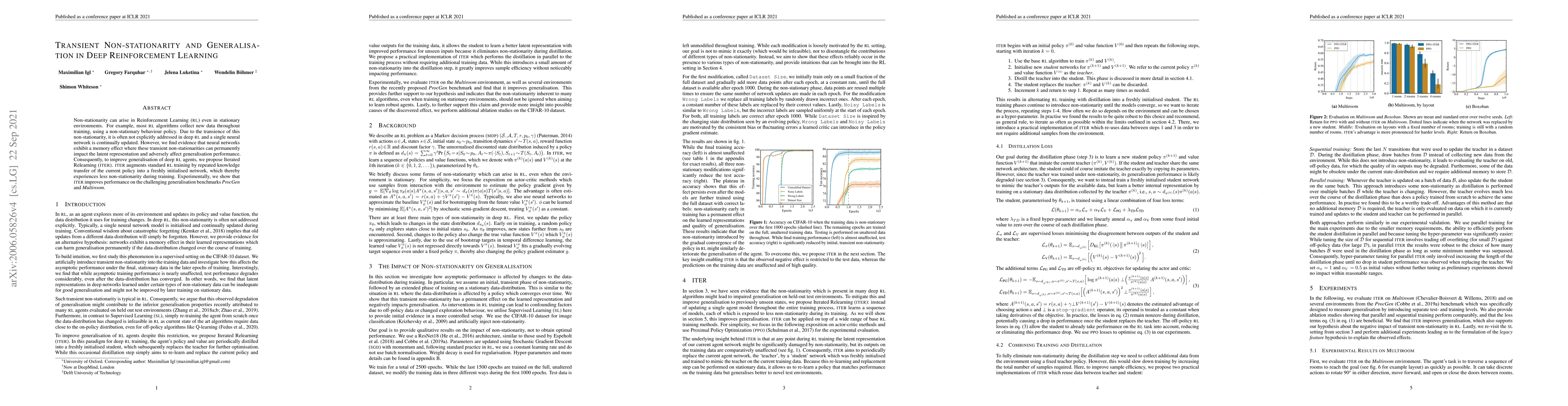 The paper investigates transient non-stationarity in deep reinforcement learning (RL) by proposing Iterated Relearning (ITER). ITER augments standard RL training by repeated knowledge transfer of the current policy into a freshly initialized network, reducing the impact of transient non-stationarities on latent representation and improving generalization.