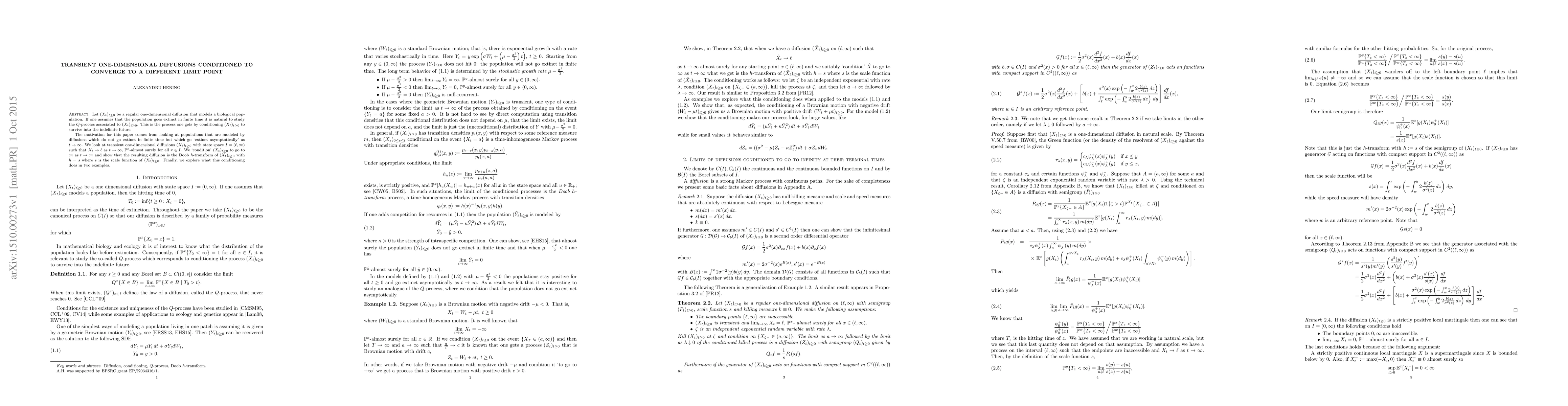 Let $(X_t)_{t\geq 0}$ be a regular one-dimensional diffusion that models a biological population. If one assumes that the population goes extinct in finite time it is natural to study the $Q$-process associated to $(X_t)_{t\geq 0}$. This is the process one gets by conditioning $(X_t)_{t\geq 0}$ to survive into the indefinite future. The motivation for this paper comes from looking at populations that are modeled by diffusions which do not go extinct in finite time but which go `extinct asymptotically' as $t\rightarrow \infty$. We look at transient one-dimensional diffusions $(X_t)_{t \geq 0}$ with state space $I=(\ell, \infty)$ such that $X_t\rightarrow \ell$ as $t\rightarrow \infty$, $\mathbb{P}^x$-almost surely for all $x\in I$. We `condition' $(X_t)_{t \geq 0}$ to go to $\infty$ as $t\rightarrow \infty$ and show that the resulting diffusion is the Doob $h$-transform of $(X_t)_{t\geq 0}$ with $h=s$ where $s$ is the scale function of $(X_t)_{t\geq 0}$. Finally, we explore what this conditioning does in two examples.