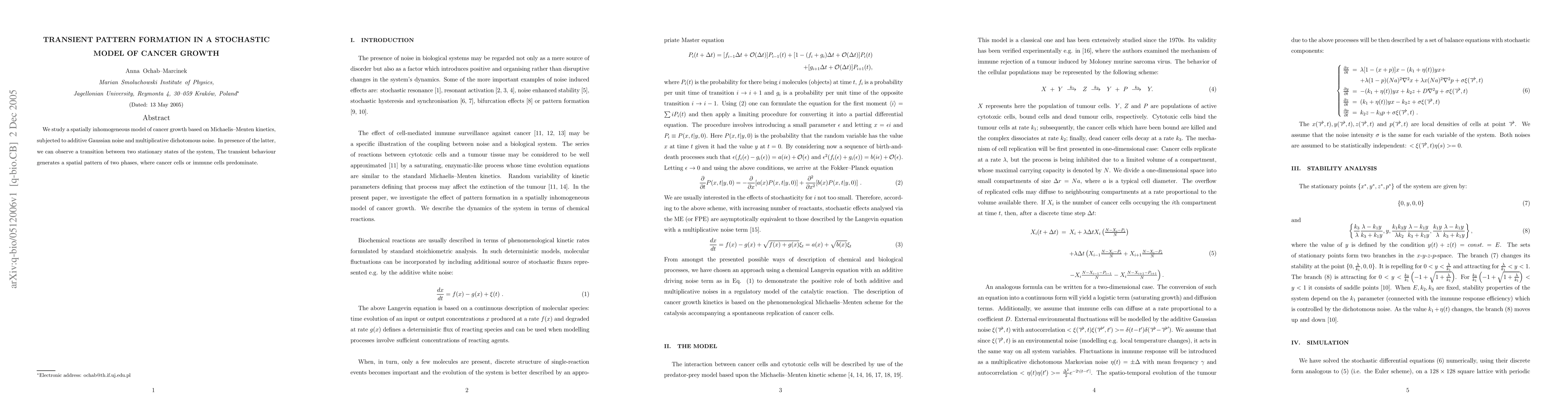 We study a spatially inhomogeneous model of cancer growth based on Michaelis--Menten kinetics, subjected to additive Gaussian noise and multiplicative dichotomous noise. In presence of the latter, we can observe a transition between two stationary states of the system. The transient behaviour generates a spatial pattern of two phases, where cancer cells or immune cells predominate.