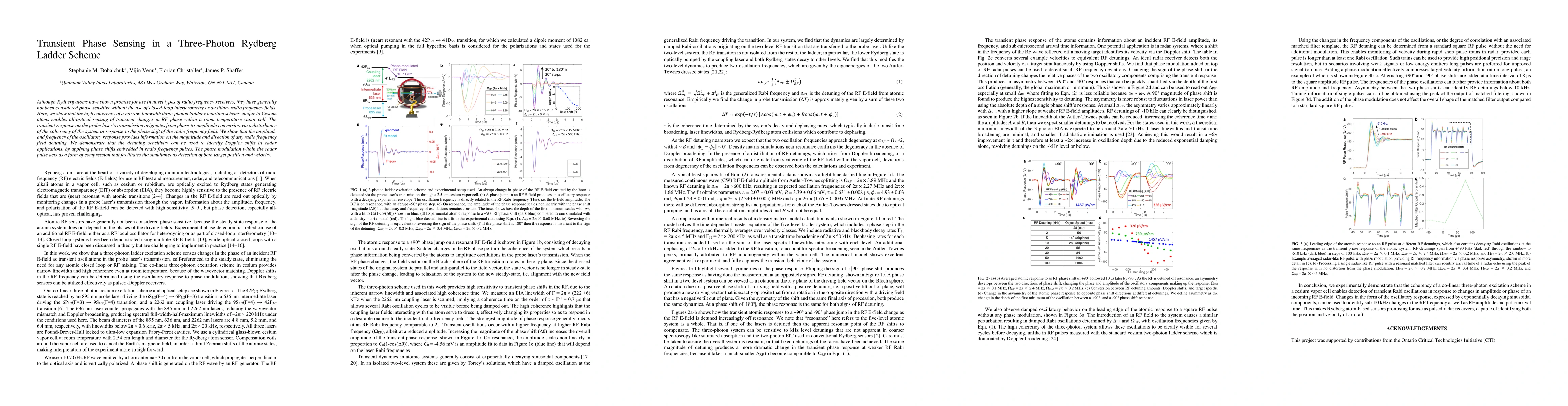 Although Rydberg atoms have shown promise for use in novel types of radio frequency receivers, they have generally not been considered phase sensitive without the use of closed-loop interferometry or auxiliary radio frequency fields. Here, we show that the high coherency of a narrow-linewidth three-photon ladder excitation scheme unique to Cesium atoms enables all-optical sensing of transient changes in RF phase within a room temperature vapor cell. The transient response on the probe laser's transmission originates from phase-to-amplitude conversion via a disturbance of the coherency of the system in response to the phase shift of the radio frequency field. We show that the amplitude and frequency of the oscillatory response provides information on the magnitude and direction of any radio frequency field detuning. We demonstrate that the detuning sensitivity can be used to identify Doppler shifts in radar applications, by applying phase shifts embedded in radio frequency pulses. The phase modulation within the radar pulse acts as a form of compression that facilitates the simultaneous detection of both target position and velocity.