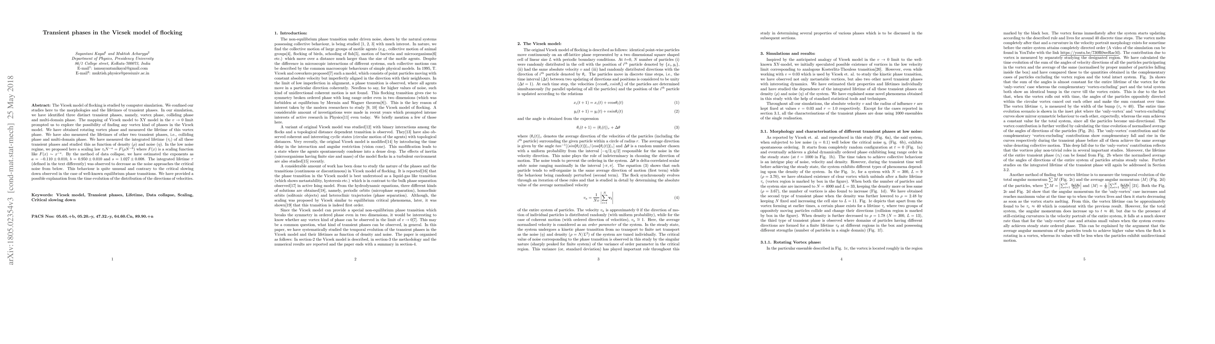 This study investigates the transient phases in the Vicsek model of flocking through computer simulations, identifying three phases: vortex, colliding, and multi-domain. The research measures the lifetimes of these phases and proposes a scaling law for the integrated lifetime, finding unusual behavior as noise approaches criticality, contrary to typical critical slowing down.