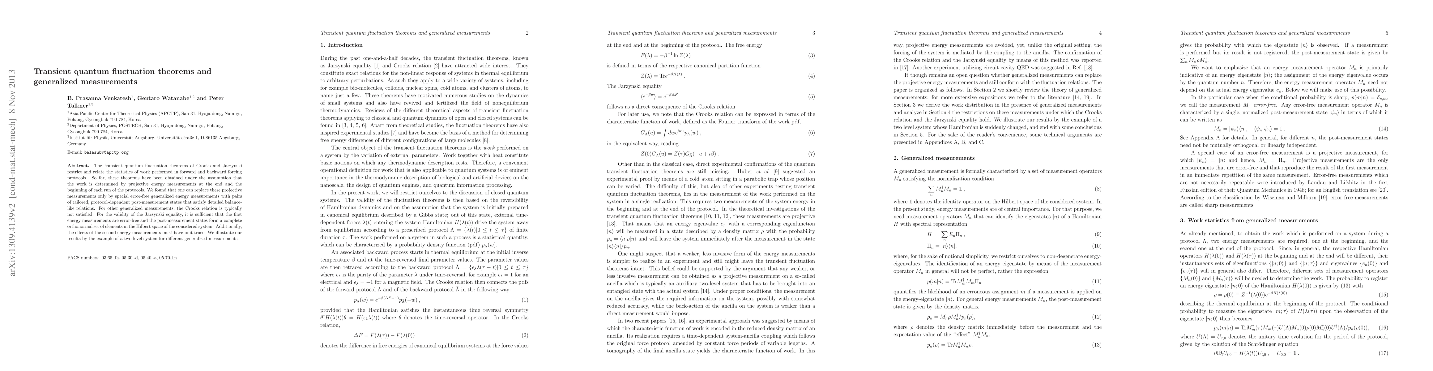This paper explores transient quantum fluctuation theorems under generalized measurements, showing that error-free, protocol-dependent measurements can replace projective measurements while maintaining the Crooks relation. The Jarzynski equality holds if measurements are error-free and post-measurement states form a complete orthonormal set, illustrated through a two-level system example.