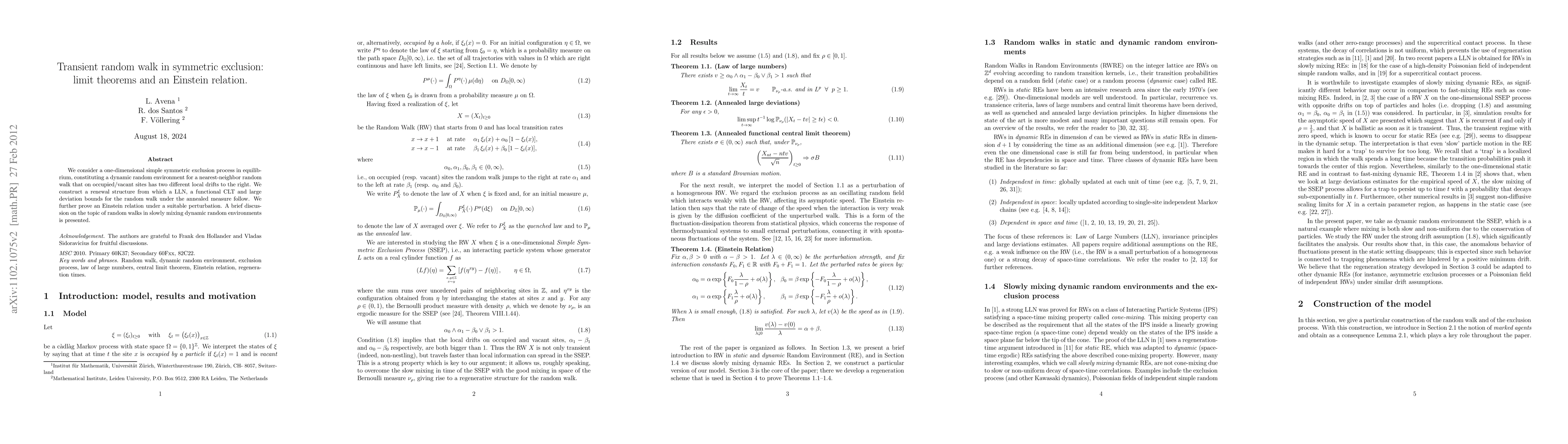 This paper studies a one-dimensional simple symmetric exclusion process and its effect on a transient random walk, deriving a law of large numbers, a functional central limit theorem, and large deviation bounds. It also proves an Einstein relation under a perturbation and briefly discusses random walks in slowly mixing environments.