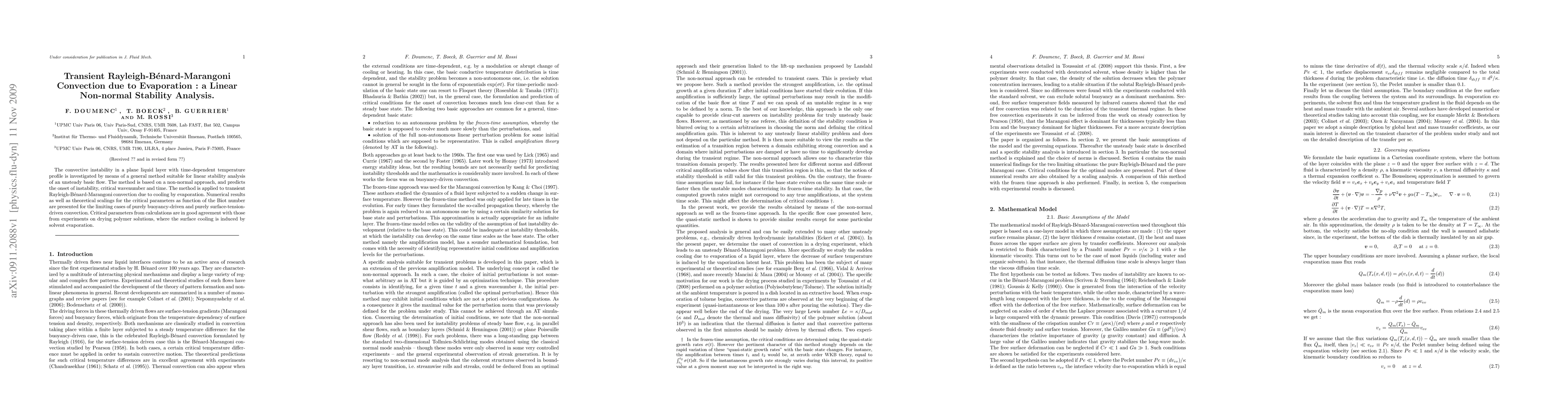 This paper investigates the linear stability of transient Rayleigh-Benard-Marangoni convection driven by evaporation using a non-normal approach. The method predicts the onset of instability, critical wave number, and time, and is validated against experimental results on drying polymer solutions.