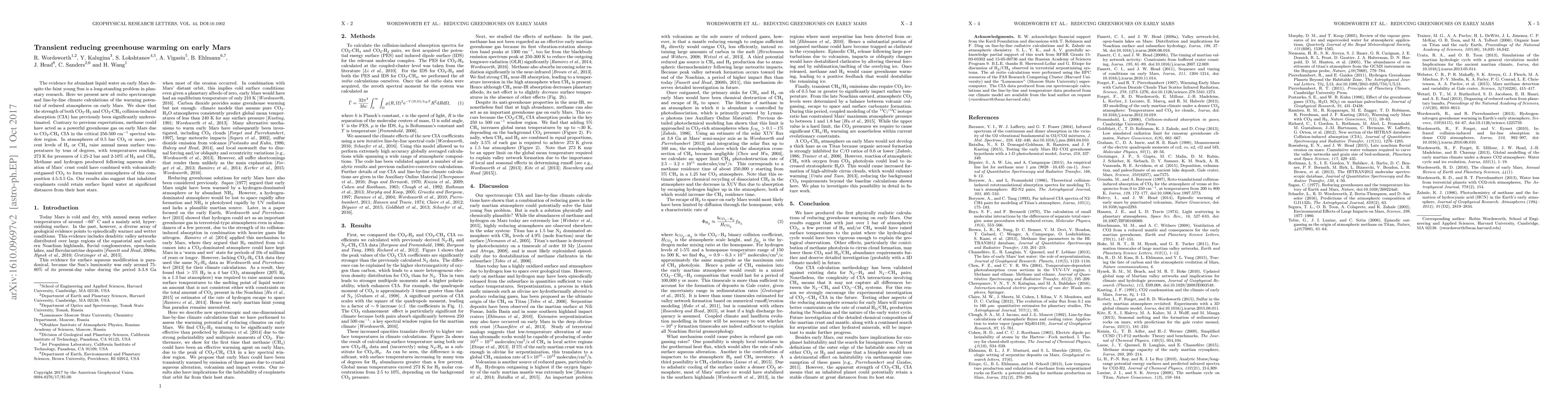 This paper demonstrates that reduced gases like hydrogen and methane, when combined with CO2, could have significantly warmed early Mars, resolving the paradox of liquid water despite a faint young Sun. The study highlights the underestimated greenhouse effect of CO2-CH4 collision-induced absorption, suggesting that such atmospheres could have sustained liquid water on Mars and potentially on habitable exoplanets.