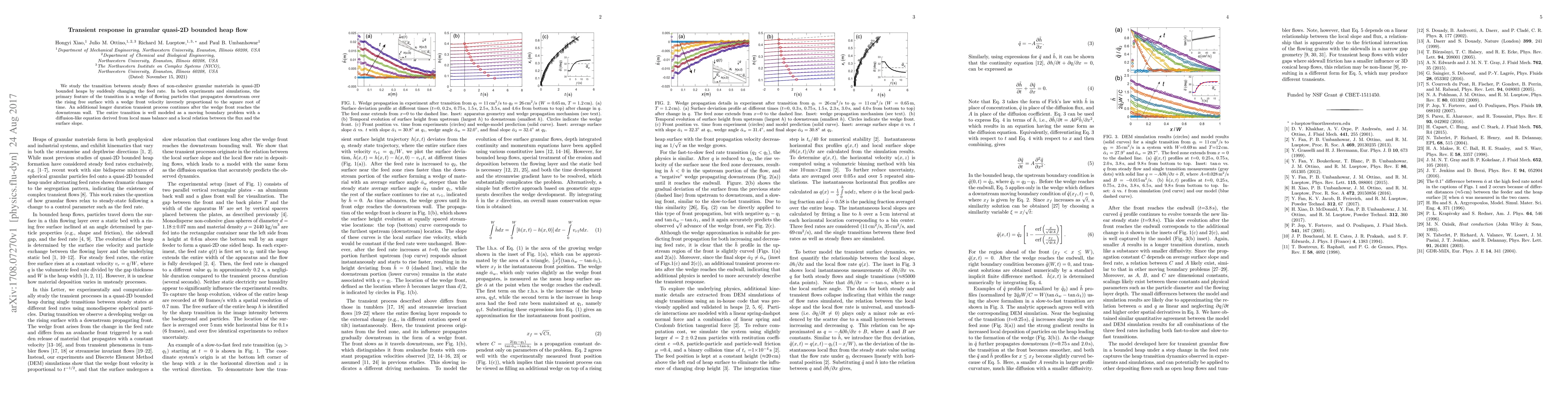 We study the transition between steady flows of non-cohesive granular materials in quasi-2D bounded heaps by suddenly changing the feed rate. In both experiments and simulations, the primary feature of the transition is a wedge of flowing particles that propagates downstream over the rising free surface with a wedge front velocity inversely proportional to the square root of time. An additional longer duration transient process continues after the wedge front reaches the downstream wall. The entire transition is well modeled as a moving boundary problem with a diffusion-like equation derived from local mass balance and a local relation between the flux and the surface slope.