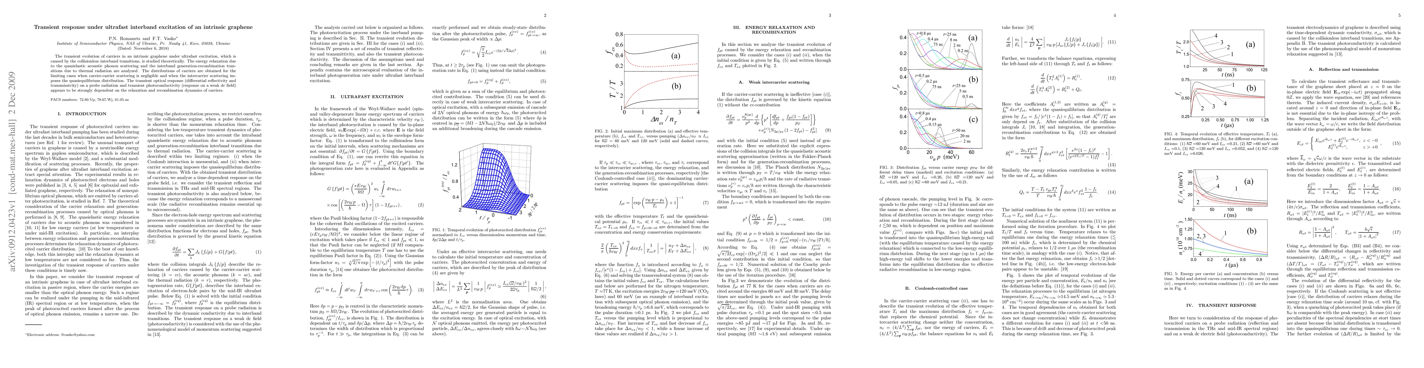 This paper theoretically investigates the transient carrier dynamics in intrinsic graphene following ultrafast interband excitation, focusing on energy relaxation and recombination processes. The study reveals that the transient optical response and photoconductivity are significantly influenced by the relaxation and recombination dynamics of carriers.