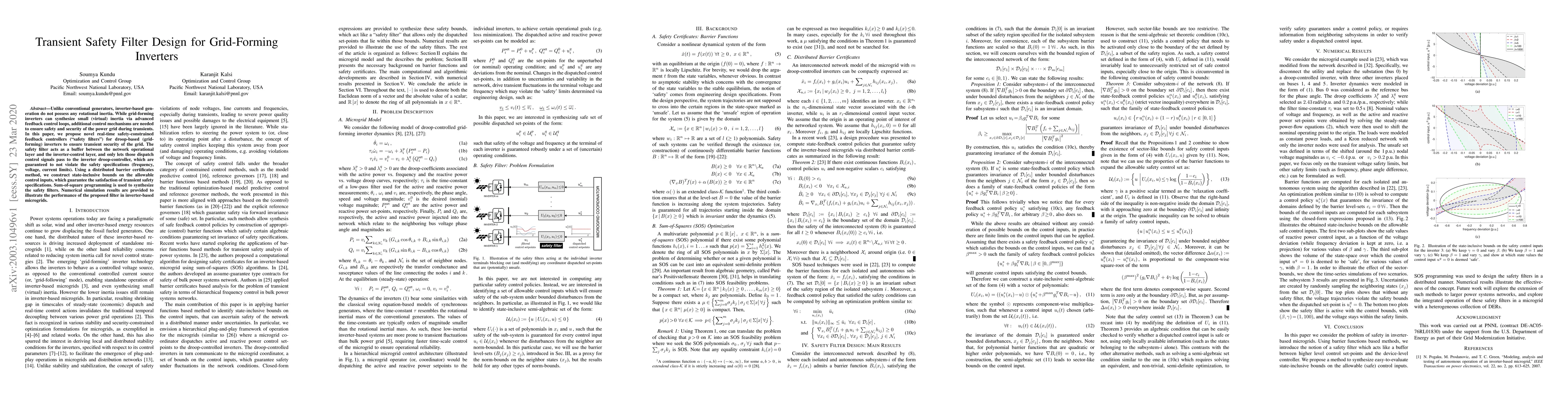 Unlike conventional generators, inverter-based generation do not possess any rotational inertia. While grid-forming inverters can synthesize small (virtual) inertia via advanced feedback control loops, additional control mechanisms are needed to ensure safety and security of the power grid during transients. In this paper, we propose novel real-time safety-constrained feedback controllers ("safety filters") for droop-based (grid-forming) inverters to ensure transient security of the grid. The safety filter acts as a buffer between the network operational layer and the inverter-control layer, and only lets those dispatch control signals pass to the inverter droop-controller, which are guaranteed to not violate the safety specifications (frequency, voltage, current limits). Using a distributed barrier certificates method, we construct state-inclusive bounds on the allowable control inputs, which guarantee the satisfaction of transient safety specifications. Sum-of-square programming is used to synthesize the safety filters. Numerical simulation results are provided to illustrate the performance of the proposed filter in inverter-based microgrids.