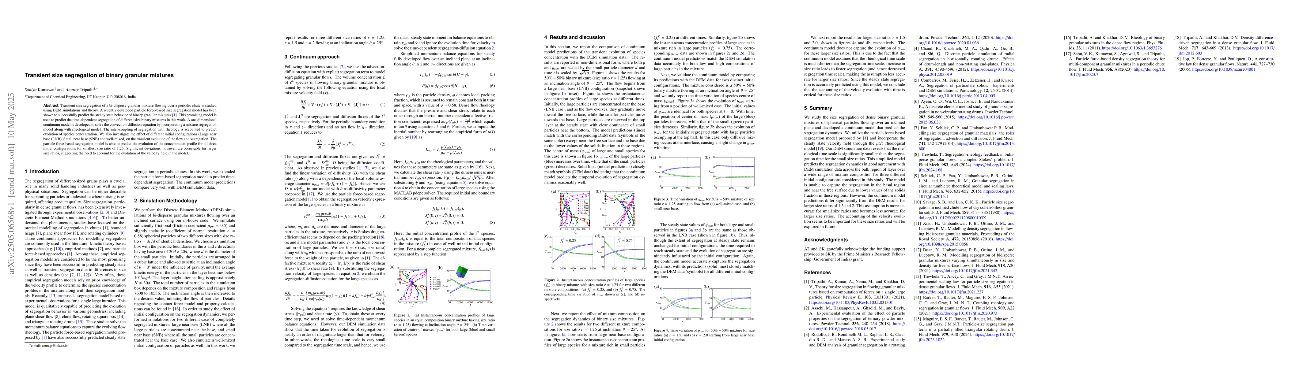 The research employs Discrete Element Method (DEM) simulations and theory to study transient size segregation of binary granular mixtures flowing over a periodic chute. A particle force-based size segregation model and a one-dimensional continuum model incorporating a mixture segregation model alongside a rheological model are utilized.