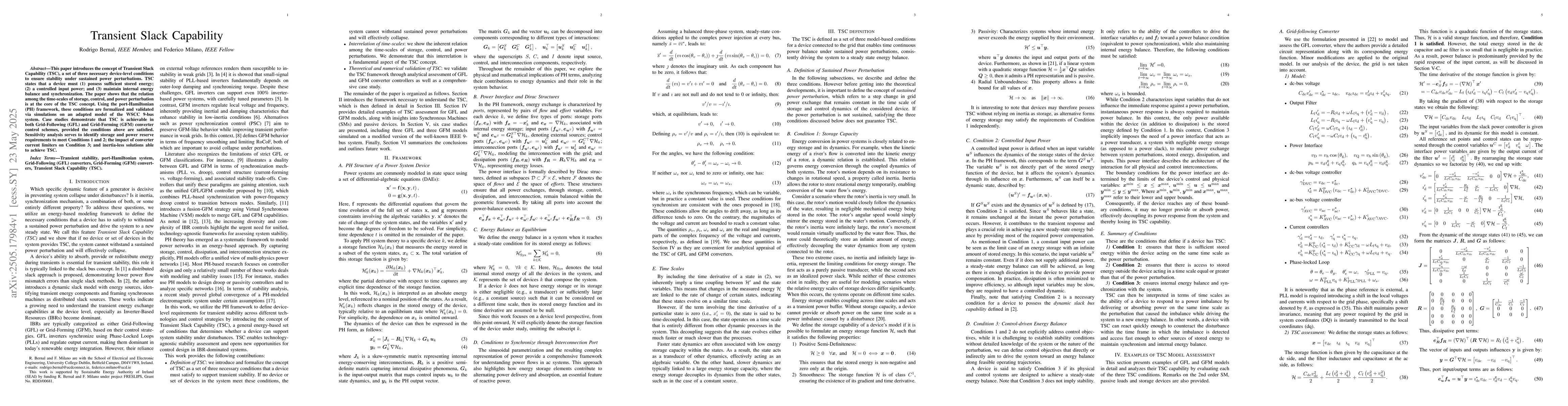The research introduces the concept of Transient Slack Capability (TSC) using the port-Hamiltonian (PH) framework, formalizing conditions for stability under power perturbations. These conditions are validated via simulations on an adapted model of the WSCC 9-bus system.