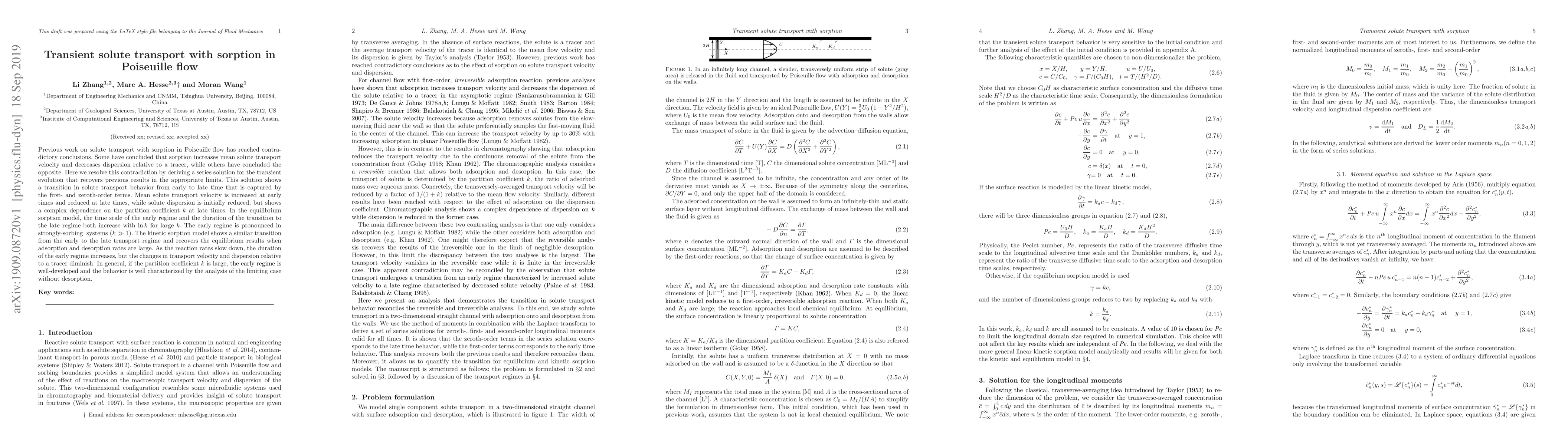 Research resolves a contradiction in solute transport with sorption in Poiseuille flow, showing a transition from increased to decreased mean velocity and dispersion over time, depending on the partition coefficient k.