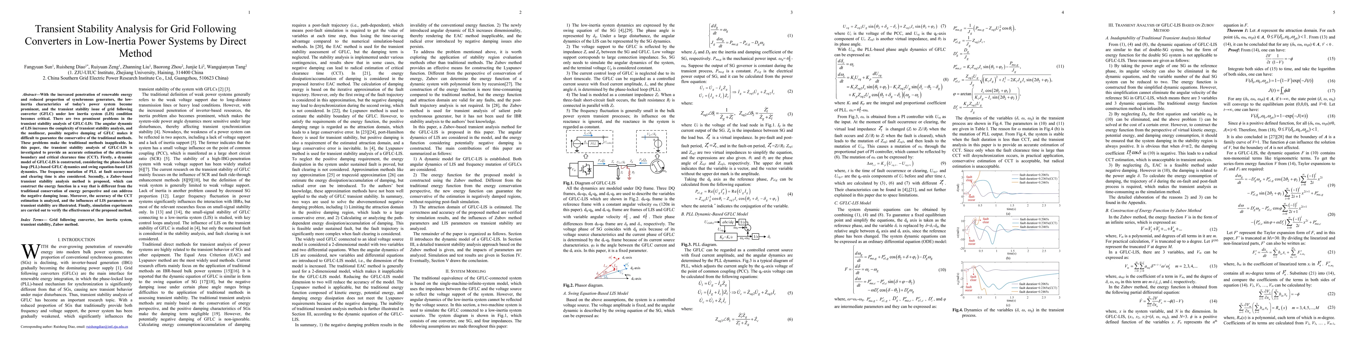 The paper proposes a Zubov-based transient stability analysis method for Grid Following Converters (GFLC) in Low-Inertia Power Systems (LIS), addressing the complexity of angular dynamics and GFLC's nonlinear, possibly negative damping.
