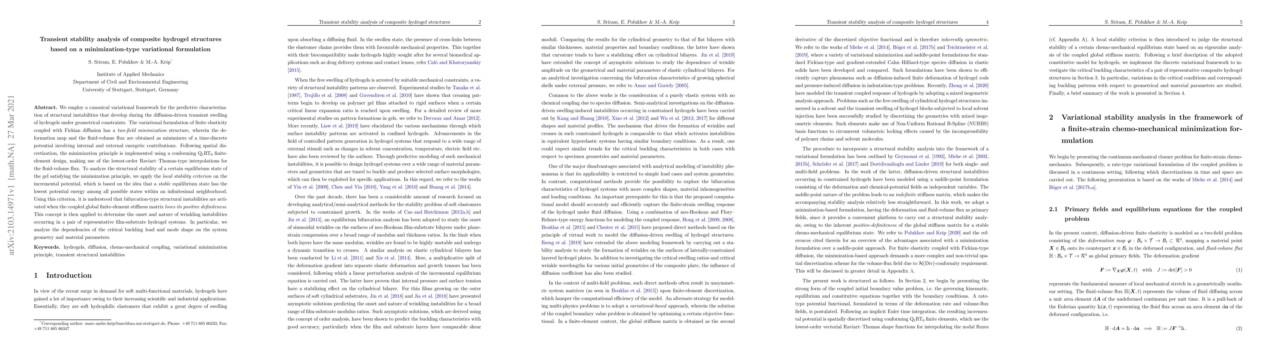 We employ a canonical variational framework for the predictive characterization of structural instabilities that develop during the diffusion-driven transient swelling of hydrogels under geometrical constraints. The variational formulation of finite elasticity coupled with Fickian diffusion has a two-field minimization structure, wherein the deformation map and the fluid-volume flux are obtained as minimizers of a time-discrete potential involving internal and external energetic contributions. Following spatial discretization, the minimization principle is implemented using a conforming Q$_1$RT$_0$ finite-element design, making use of the lowest-order Raviart-Thomas-type interpolations for the fluid-volume flux. To analyze the structural stability of a certain equilibrium state of the gel satisfying the minimization principle, we apply the local stability criterion on the incremental potential, which is based on the idea that a stable equilibrium state has the lowest potential energy among all possible states within an infinitesimal neighborhood. Using this criterion, it is understood that bifurcation-type structural instabilities are activated when the coupled global finite-element stiffness matrix loses its positive definiteness. This concept is then applied to determine the onset and nature of wrinkling instabilities occurring in a pair of representative film-substrate hydrogel systems. In particular, we analyze the dependencies of the critical buckling load and mode shape on the system geometry and material parameters.