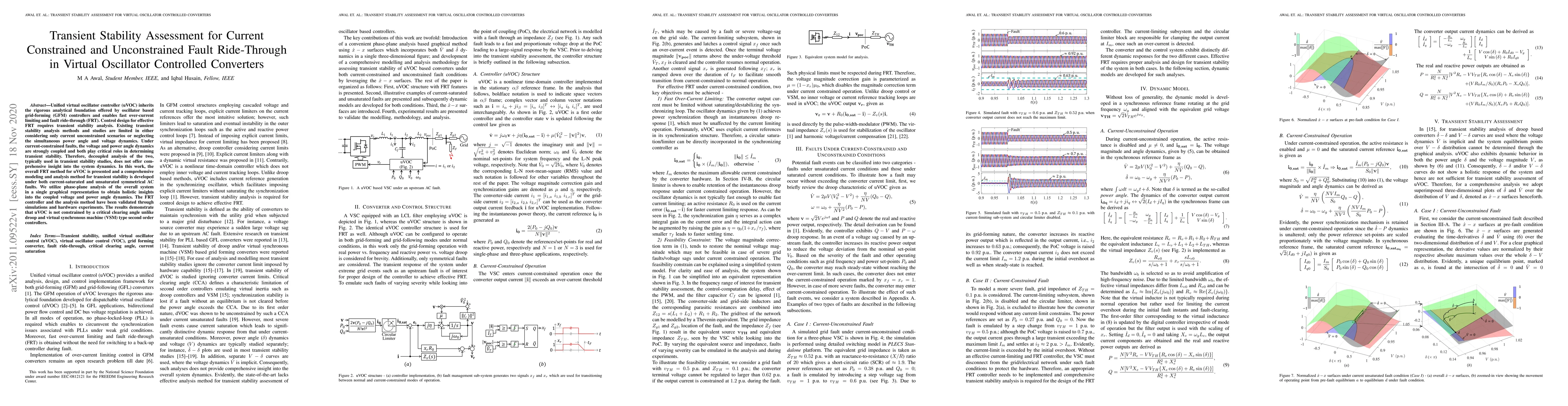 This paper presents a comprehensive transient stability analysis method for unified virtual oscillator controllers under current-constrained and unconstrained faults, utilizing phase-plane analysis to capture coupled voltage and power angle dynamics. The developed method and FRT controller are validated through simulations and hardware experiments, demonstrating superior fault ride-through performance compared to traditional second-order controllers.