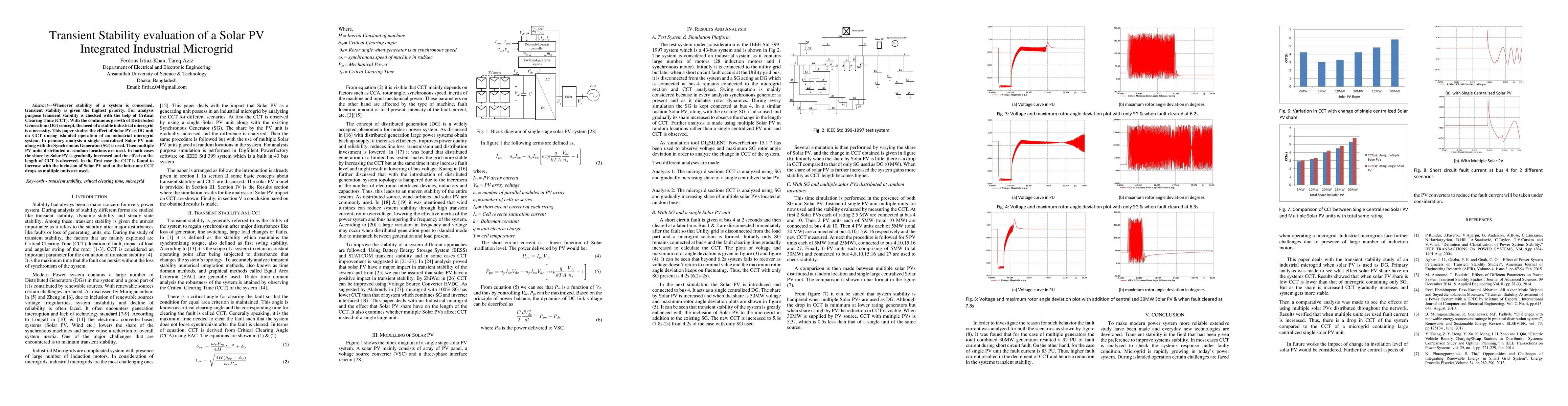 This paper evaluates the transient stability of an industrial microgrid integrating Solar PV as Distributed Generation, focusing on the Critical Clearing Time (CCT) during islanded operation. It finds that a single centralized Solar PV unit increases CCT, while multiple distributed PV units decrease it.